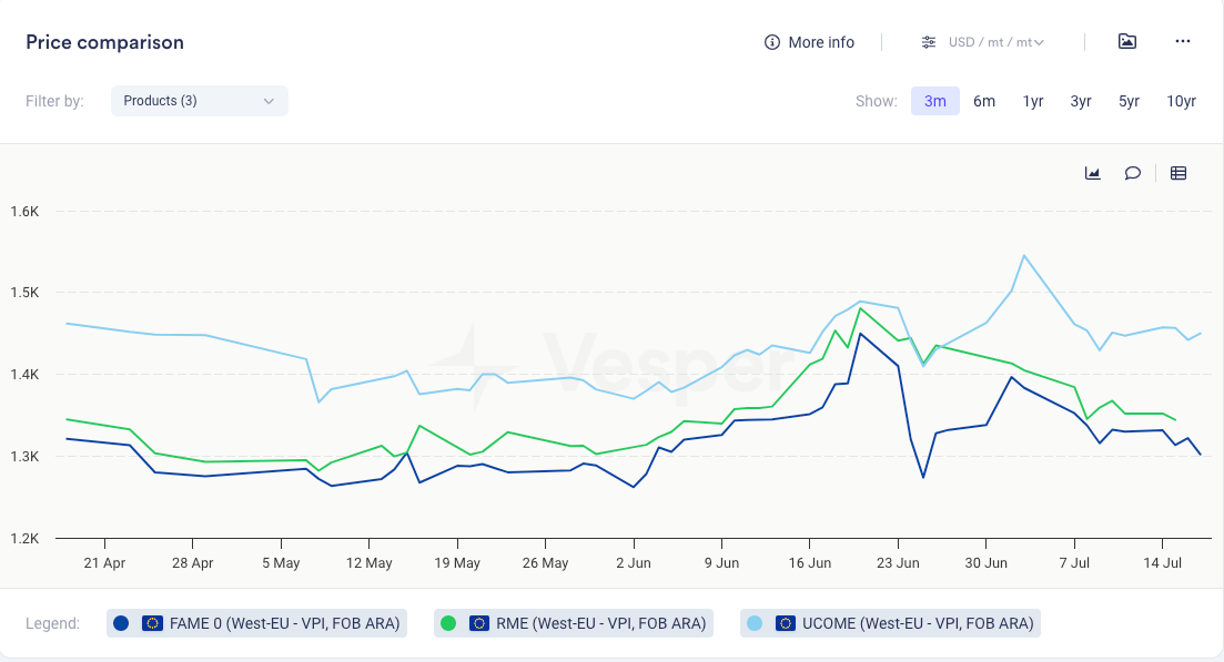 - ارتفع FAME0 بمقدار 6 دولارات للطن المتري ليصل إلى 1322 دولارًا أمريكيًا للطن المتري؛ وزاد UCOME بمقدار 13 دولارًا أمريكيًا للطن المتري ليصل إلى 1442 دولارًا أمريكيًا للطن المتري، وربما كان ذلك مدعومًا بأسعار المواد الأولية القوية
