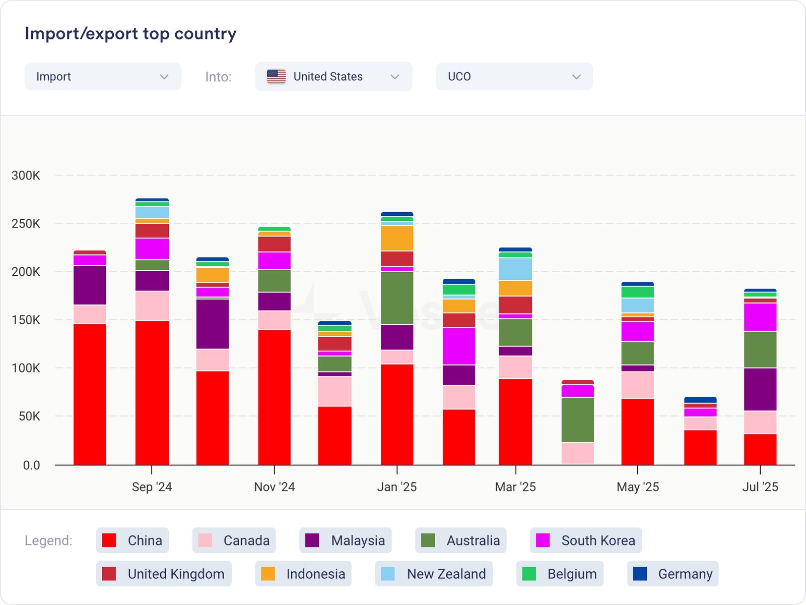 - في يوليو، انتعشت واردات UCO الأمريكية إلى 200,000 طن متري من 90,000 طن متري في يونيو. ومن المثير للاهتمام أن معظم الواردات لم تأت من الصين (انظر الرسم البياني 1). حتى الآن، شهد عام 2025 أعلى حجم لواردات UCO الأمريكية على الرغم من التغييرات المعلنة في سياسة الائتمان الضريبي.