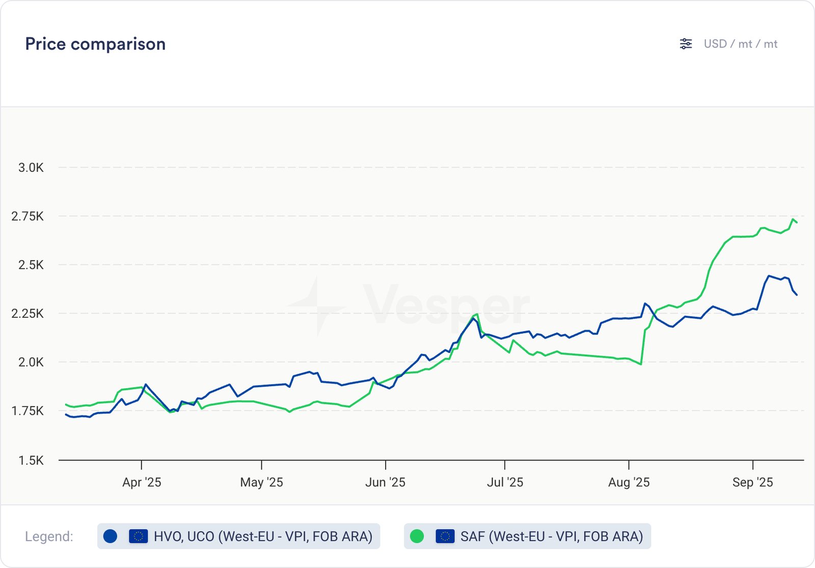 - ارتفعت أسعار FOB ARA SAF بقوة إلى 2715 دولارًا أمريكيًا للطن المتري، واستعادت علاوتها على HVO على عكس يوليو (انظر الرسم البياني 2). يقول المشاركون في السوق إنه مع تحول المنتجين إلى HVO الأفضل سعرًا، حدث نقص في المعروض في SAF، مما أدى إلى ارتفاع الأسعار مرة أخرى.