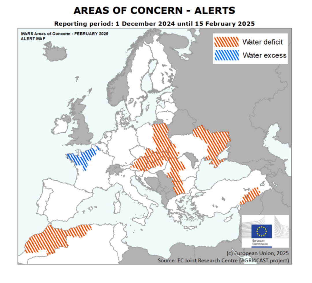 لا تزال الظروف الجوية لزراعة الربيع جيدة، مما يسمح للآلات بالعمل في الحقول. في بعض أجزاء شمال أوروبا، لا تزال درجة حرارة التربة منخفضة، ولكنها مستمرة في التحسن. فيما يلي حالة فائض المياه والعجز حتى 15 فبراير. أصبحت الظروف أكثر ملاءمة في شمال فرنسا، في حين أن جنوب غرب أوروبا لا يزال يعاني من ظروف جافة نسبيًا، ويمكن أن يستفيد من المزيد من الأمطار.