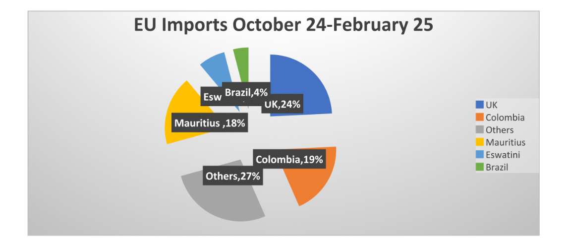 أظهرت الواردات انخفاضًا كبيرًا على أساس سنوي وفقًا للإحصاءات التي أنتجتها المفوضية الأوروبية. تم استيراد 172000 طن فقط. إذا قمنا بفك الأرقام بشكل أكبر، فإن المملكة المتحدة تقوم لأول مرة في السنوات الأخيرة بتصدير السكر إلى أوروبا (بشكل رئيسي أيرلندا بعد التعديلات بموجب اتفاقية وندسور)، ومع ذلك، فقد استوردت صافي 50000 طن من الاتحاد الأوروبي خلال نفس الفترة.