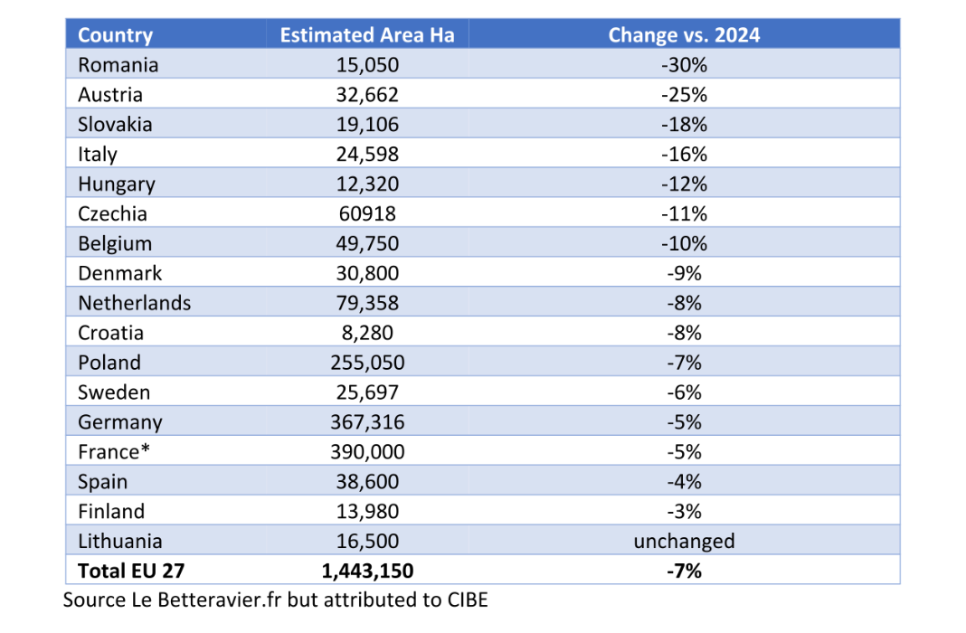 لا توجد أرقام رسمية متاحة، لكن British Sugar تعتقد أن المملكة المتحدة قد خفضت المساحة المزروعة ‘بشكل تقريبي’ بنسبة 8٪ إلى 95000 هكتار من 102000 هكتار وفقًا لـ Farmers Weekly.