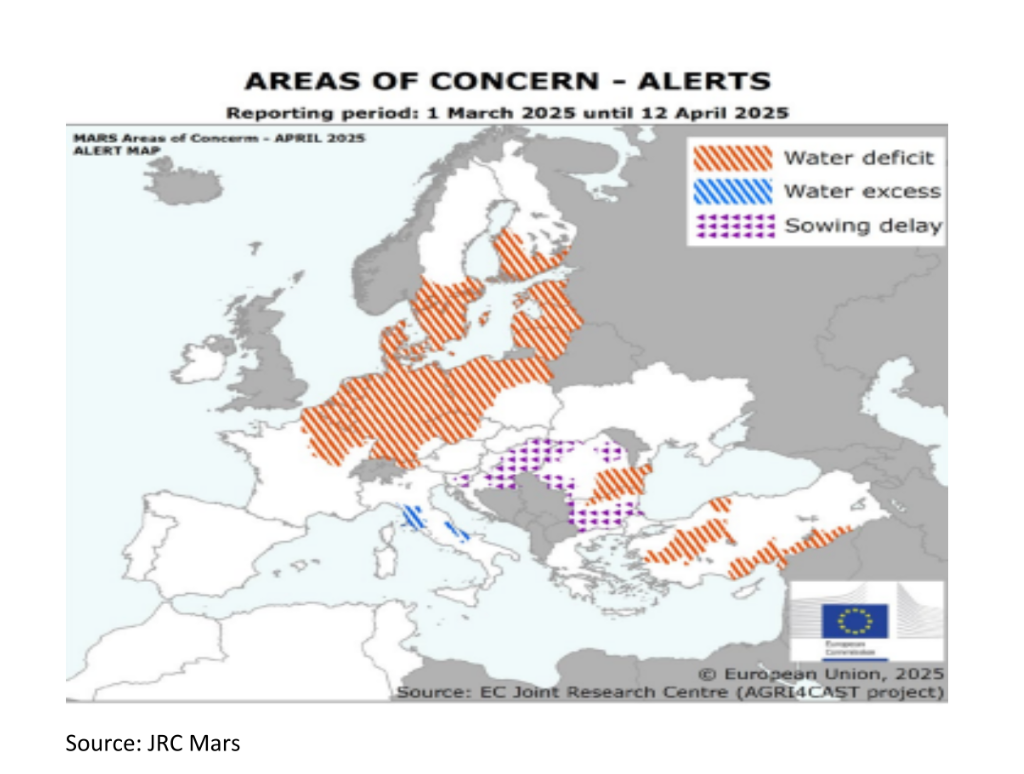 الوضع المحصولي في لحظة الأبواب المنزلقة. كانت الزراعة مبكرة وكانت رطوبة التربة جيدة في ذلك الوقت. في الأسابيع المقبلة بدون هطول أمطار كبير، ستصبح المحاصيل مجهدة، وهو أمر يحدث بالفعل في المملكة المتحدة التي شهدت ظروفًا أكثر جفافًا من أوروبا الشمالية القارية.