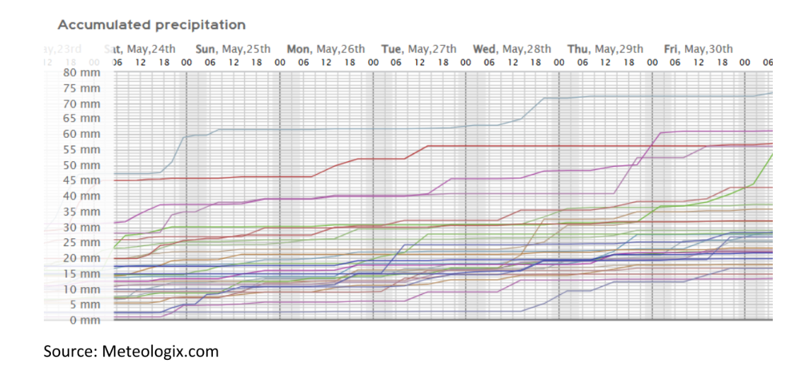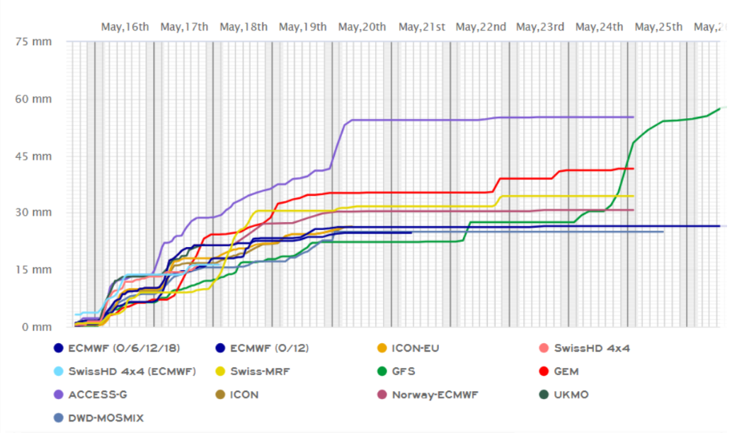 في جميع أنحاء أجزاء أخرى من أوروبا، تعود الأمطار. تعرضت بولندا لأمطار غزيرة الأسبوع الماضي. يوضح الرسم البياني أدناه تراكمات هطول الأمطار المتوقعة لمنطقة وارسو خلال الأسبوع المقبل.