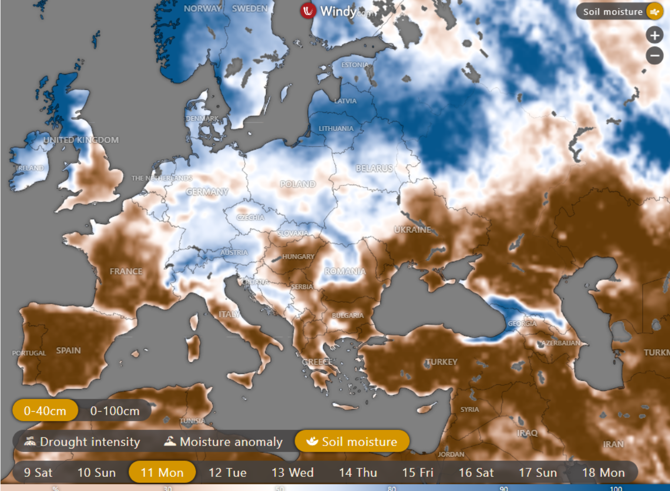 يوضح الرسم البياني أدناه مستويات رطوبة التربة اعتبارًا من 11 أغسطس، وهي جيدة بصرف النظر عن معظم فرنسا وإنجلترا.