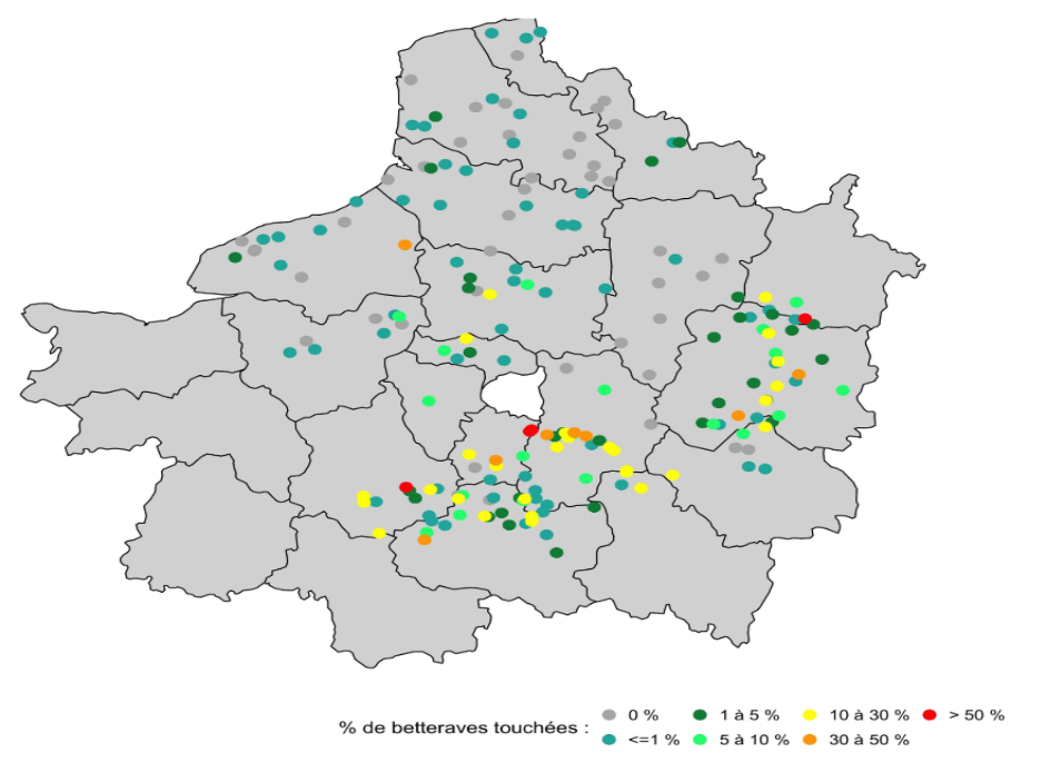 تعتبر مقاطعات Nord و Pas-de-Calais و Aisne و Seine-Maritime خالية نسبيًا من الفيروسات الصفراء. تبلغ الإصابات أقل من 5٪ من المناطق الأكثر تضررًا. تميل هذه إلى أن تكون في أطراف الحقول أو في الحقول المزروعة الأصغر حجمًا ومن غير المرجح أن يكون لها تأثير مادي على الإنتاج. في المقابل، تعد Ile-de-France المقاطعة الأكثر تضررًا بشدة حيث تأثرت 20٪ من المزروعات على 25٪ من المساحة. تظهر Champagne و Centre-Val-de-Loire 10٪ من المزروعات المتأثرة بنسب مماثلة. تقع Eure و Somme في مكان ما بين الطرفين المتطرفين.