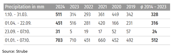 يمكن أيضًا أن تُعزى نسبة البنجر والغلة لكل هكتار إلى الأمطار الغزيرة التي شهدتها هذا العام. في حين أنها تتماشى مع تلك الموجودة في الموسم الماضي، فإن ما يثير القلق هو الاتجاه على مدار السنوات الخمس الماضية، والذي يُظهر اتجاهًا تصاعديًا في مستويات هطول الأمطار، خاصة منذ عام 2020. يوضح الجدول أدناه هطول الأمطار لمنطقة الراينلاند كمثال