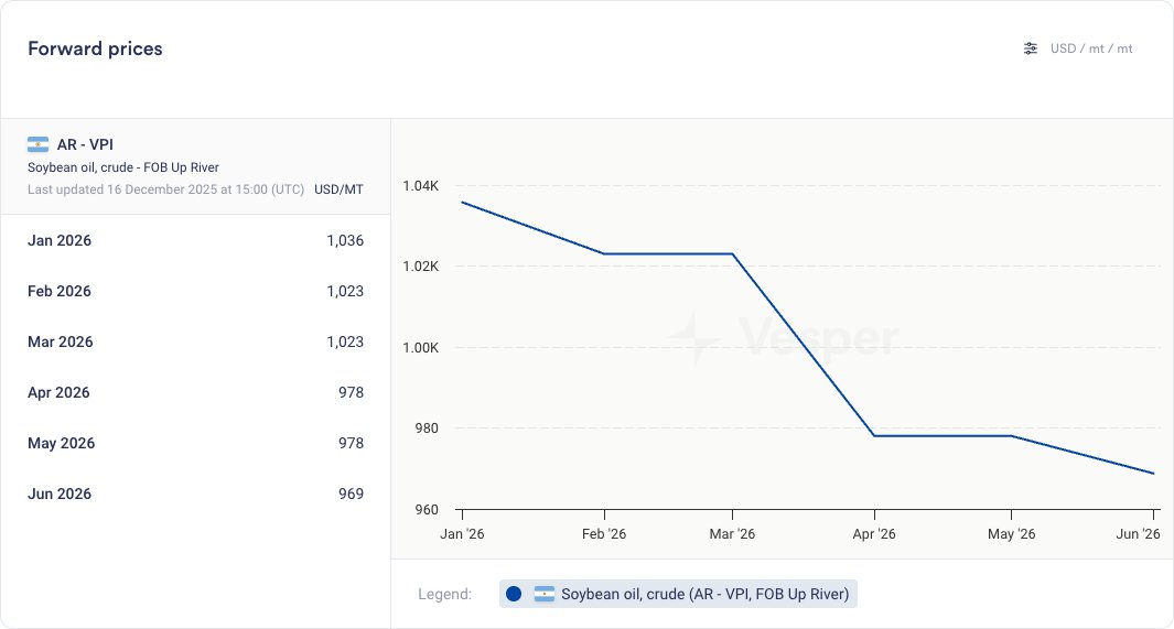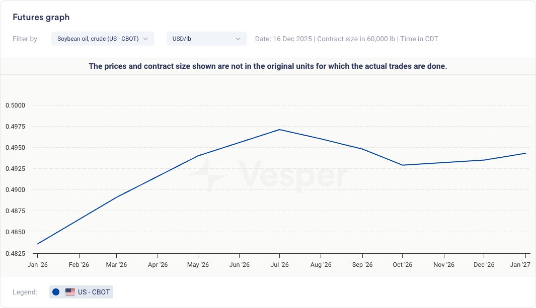 - انخفضت أسعار زيت فول الصويا الخام في CBOT إلى 49.4800 سنتًا أمريكيًا/رطل من 51.1800 سنتًا أمريكيًا/رطل في نفس الوقت من الأسبوع الماضي. كان متوسط سعر البيع الفوري لشهر ديسمبر أعلى قليلاً من متوسط شهر نوفمبر، في حين أن منحنى العقود الآجلة لا يزال في حالة كونتانغو، مما يعكس توقعات بارتفاع الطلب في عام 2026 من قطاع الديزل الحيوي المحلي