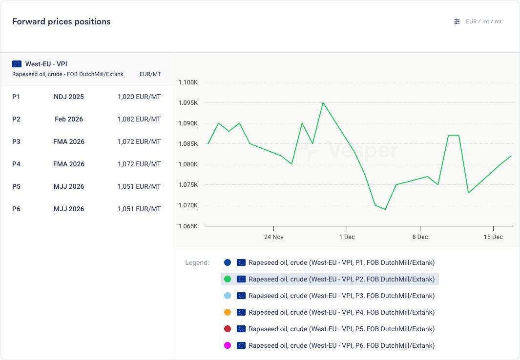 - ارتفعت أسعار زيت بذور اللفت الخام FMA (FDM) إلى 1083 يورو/طن متري من 1075 يورو/طن متري. لا يزال متوسط سعر البيع الفوري لشهر ديسمبر أقل من مستويات نوفمبر. السوق في حالة تراجع