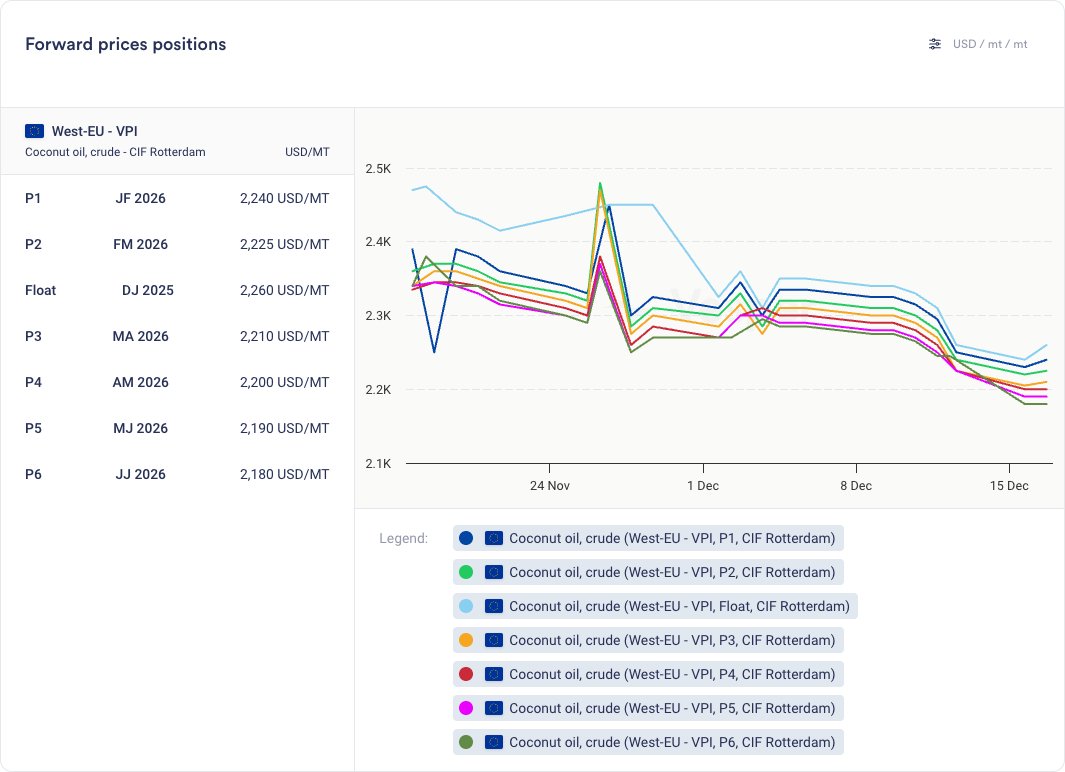 يتوقع المشاركون في السوق ارتفاع إنتاج زيت جوز الهند وزيت نواة النخيل في عام 2026، بعد انخفاض إنتاج زيت جوز الهند في عام 2025. بالإضافة إلى ذلك، بسبب المخاوف بشأن ارتفاع أسعار زيت جوز الهند المحلي – والذي يستخدم بالتبادل مع زيت النخيل الأولين للطبخ – أجلت السلطات الفلبينية الزيادة المخطط لها في تفويض الديزل الحيوي من 3٪ إلى 4٪، والمقرر أصلاً لشهر أكتوبر 2025. قد تؤثر هذه العوامل على أسعار الزيوت اللوريكية في عام 2026.