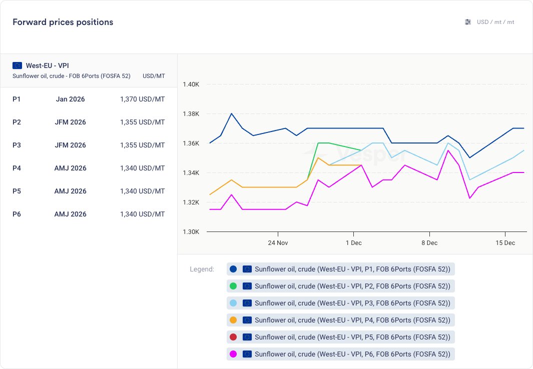 - في تقرير WASDE لشهر ديسمبر، خفضت وزارة الزراعة الأمريكية توقعات الإنتاج العالمي من عباد الشمس من 54.26 مليون طن متري إلى 51.77 مليون طن متري (–2.49 مليون طن متري)، مقارنة بـ 52.14 مليون طن متري تم إنتاجها في العام الماضي. ونتيجة لذلك، انخفض الاستهلاك العالمي (الرئيسي هو السحق) أيضًا بمقدار 2.34 مليون طن متري ليصل إلى 51.76 مليون طن متري