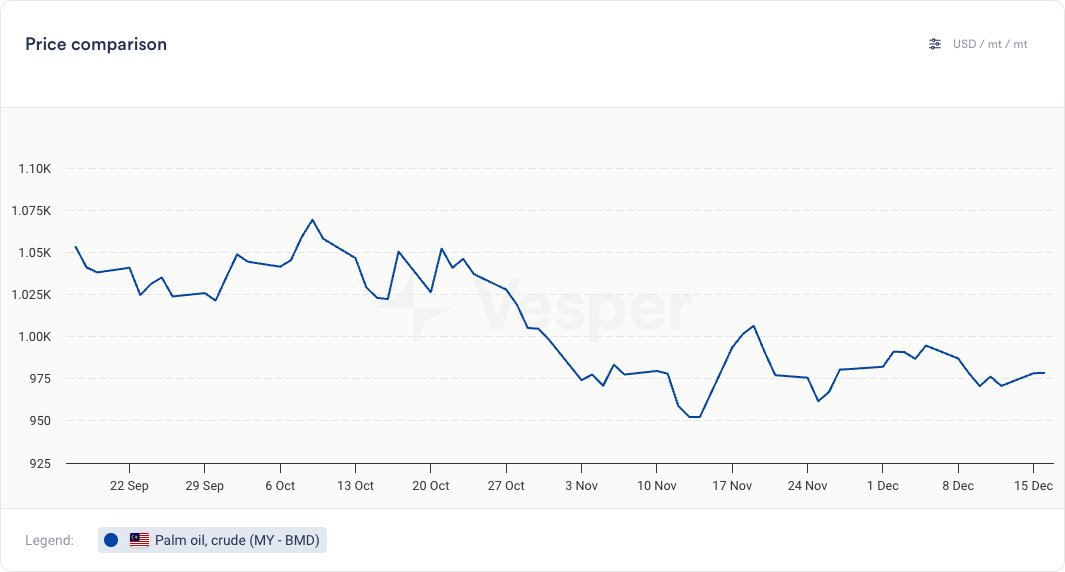 - بلغت شحنات زيت النخيل من ماليزيا خلال الفترة من 1 إلى 15 ديسمبر 613172 طنًا متريًا (–16٪ مقارنة بالفترة نفسها من الشهر الماضي)
