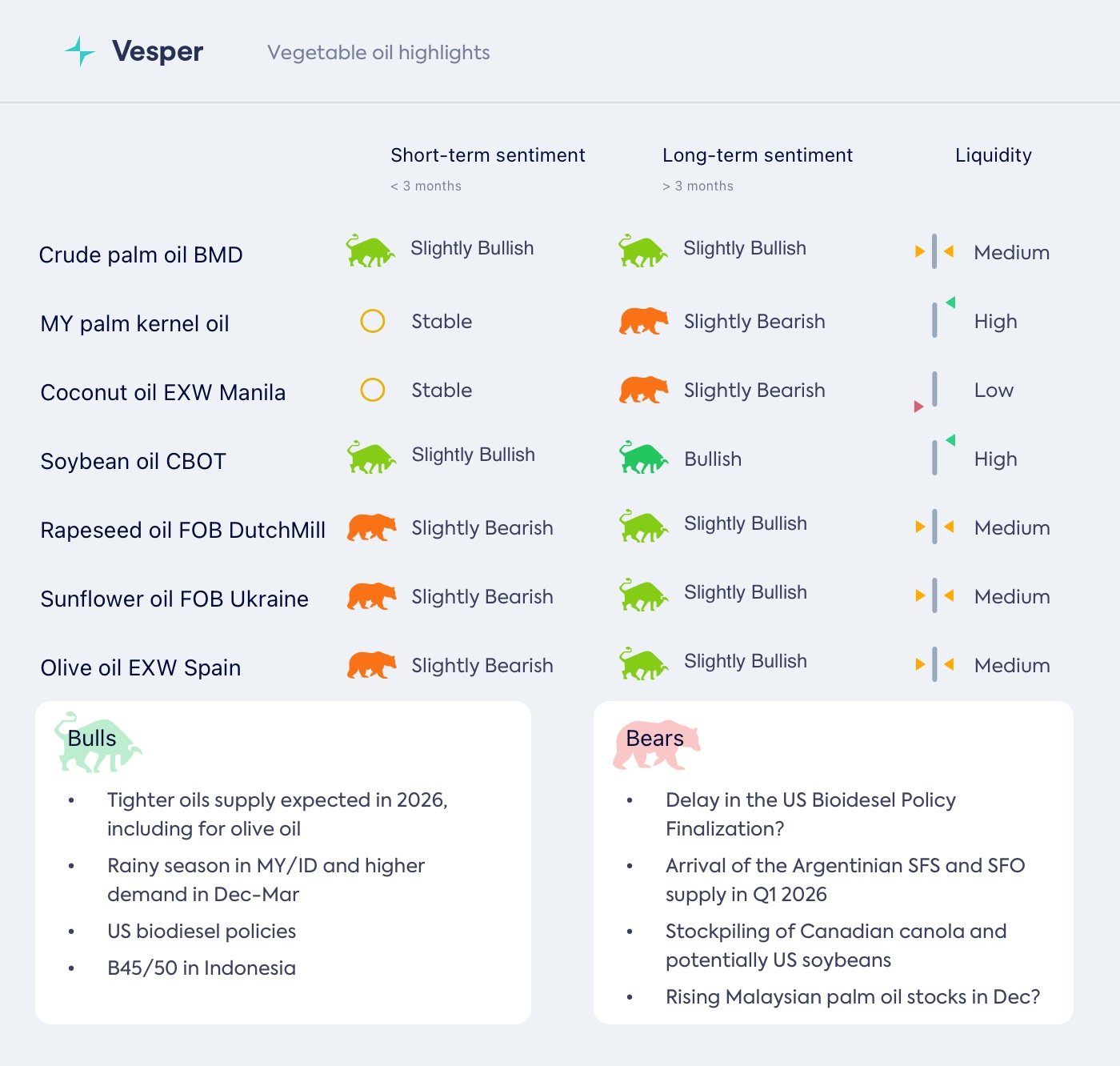 - على المدى الطويل: إذا تبين أن الإنتاج في ماليزيا وإندونيسيا أقل من المتوقع، فيجب أن تظل الأسعار مدعومة جيدًا – حتى لو تأخر تنفيذ B50 في إندونيسيا – بسبب تفويض B40 الحالي أو B45 المحتمل. يمكن أن توفر إمدادات زيت عباد الشمس الضيقة وصادرات زيت فول الصويا الأبطأ دعمًا إضافيًا. ما زلنا متفائلين لعام 2026.