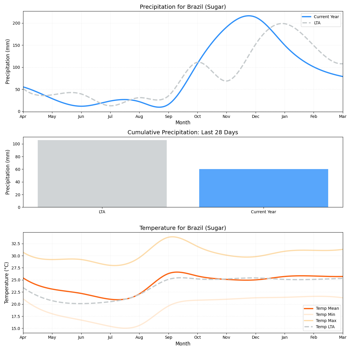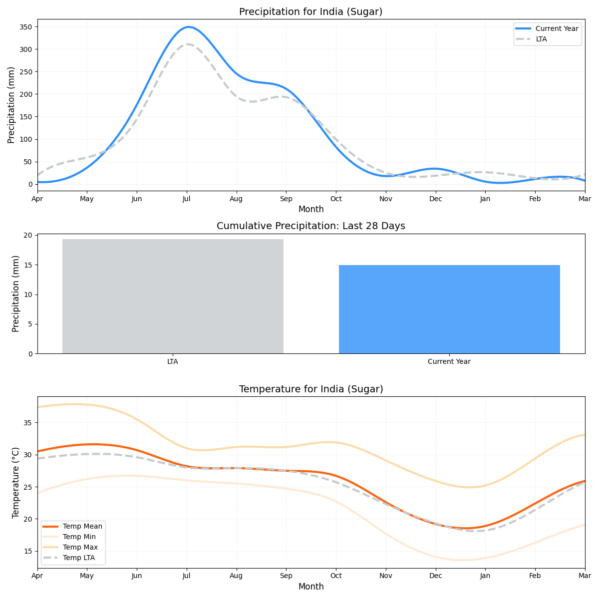 - درجة الحرارة: أعلى هامشيًا من المتوسط (25.14 درجة مئوية مقابل 24.92 درجة مئوية)، مما يجعل ظروف النمو أكثر دفئًا قليلاً لقصب السكر.
