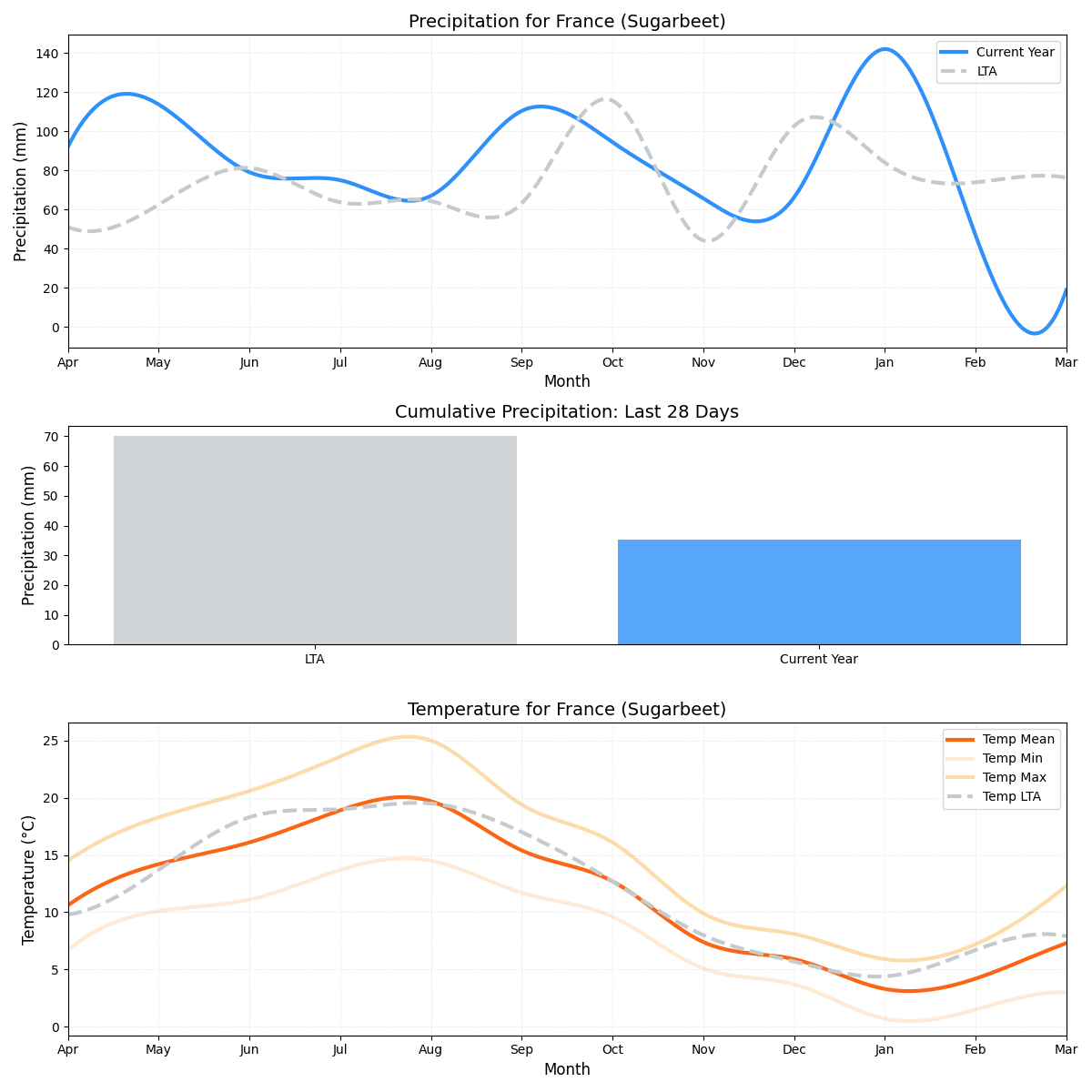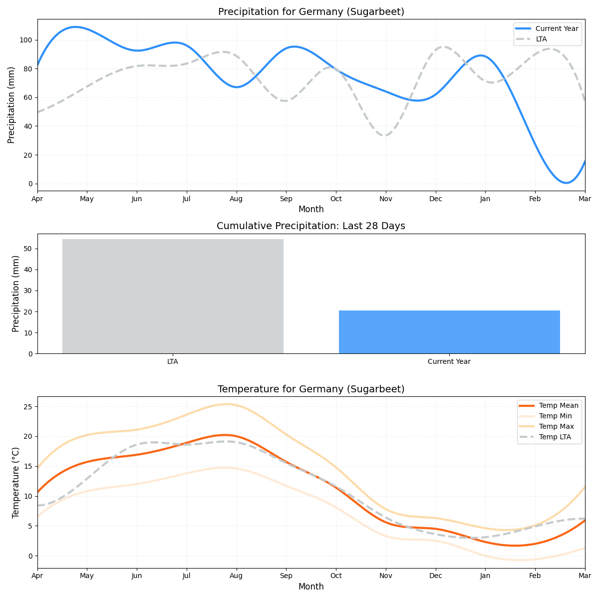 - هطول الأمطار: أقل بحوالي 71٪ من المتوسط (0.48 ملم مقابل 1.66 ملم). هذا الانخفاض الكبير في هطول الأمطار يمكن أن يتسبب في ضرر محتمل لإنتاج بنجر السكر.