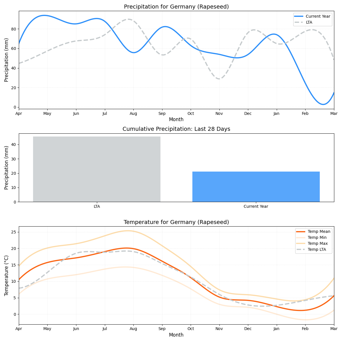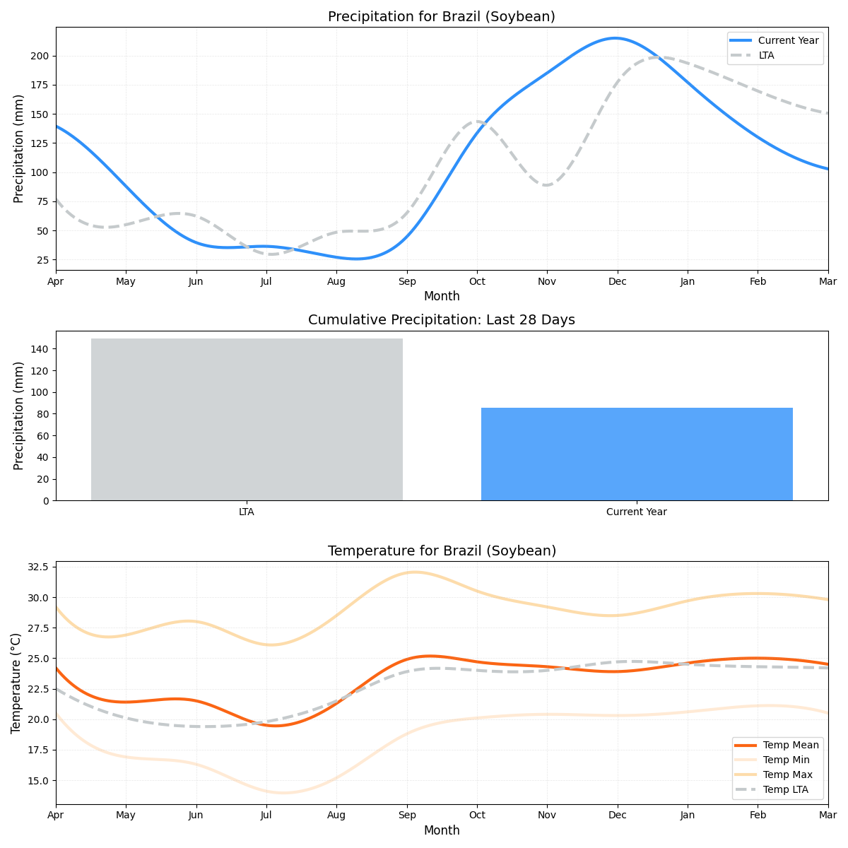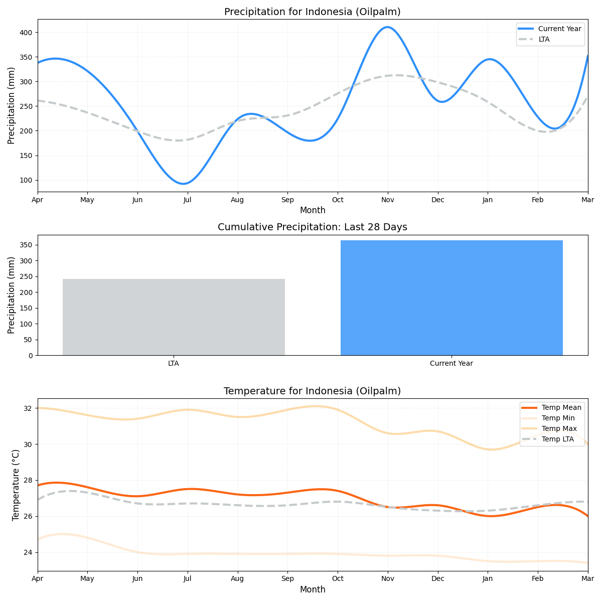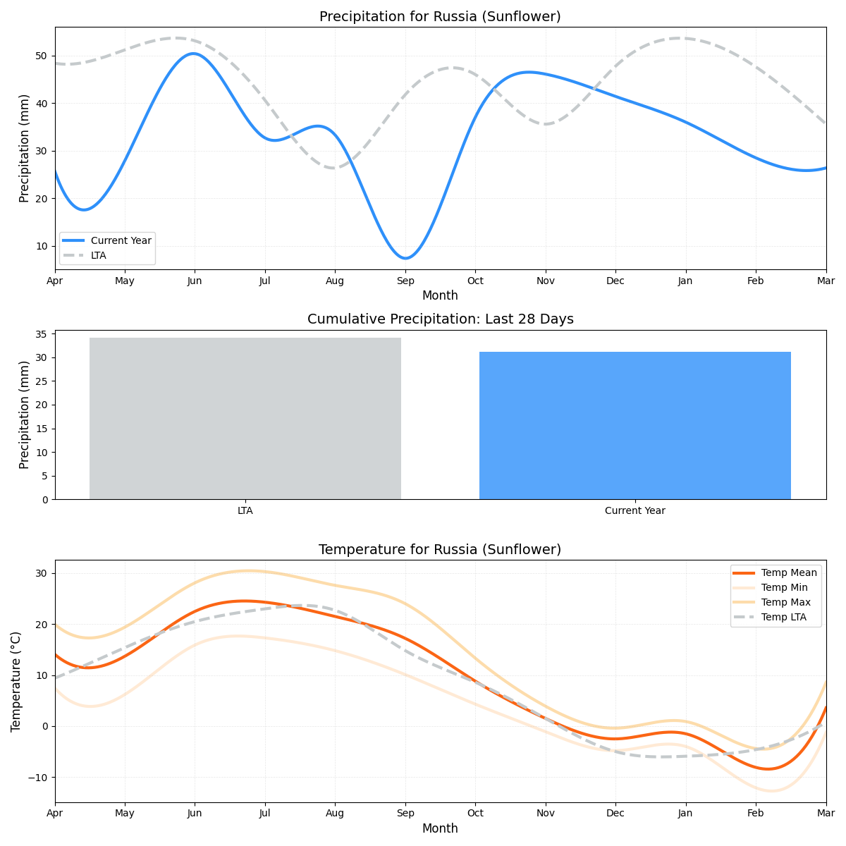 - هطول الأمطار: ليست نظرة مستقبلية مواتية مع تعرض هطول الأمطار لانتكاسة شديدة؛ حوالي 56% أقل من المتوسط (0.95 ملم مقابل 2.15 ملم).