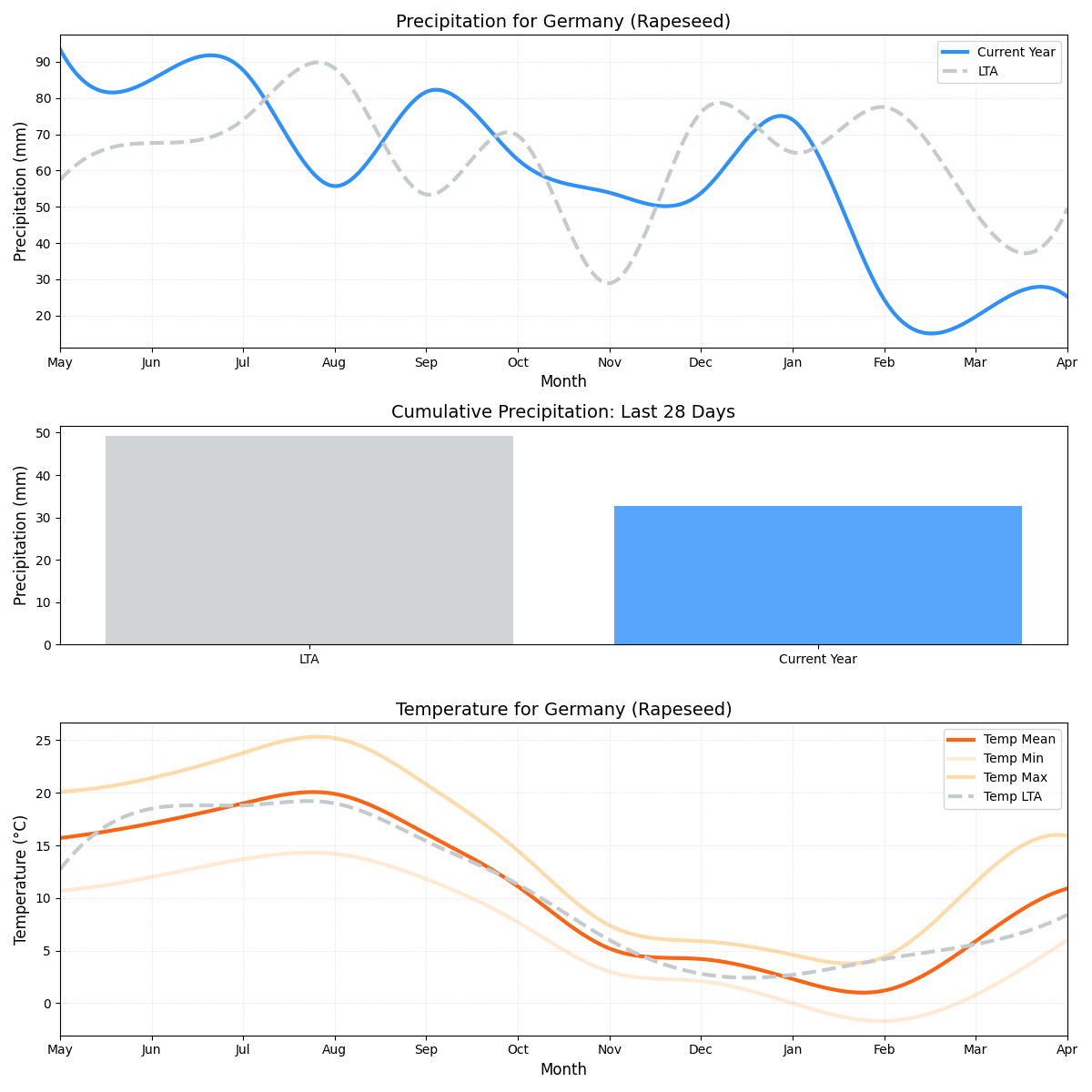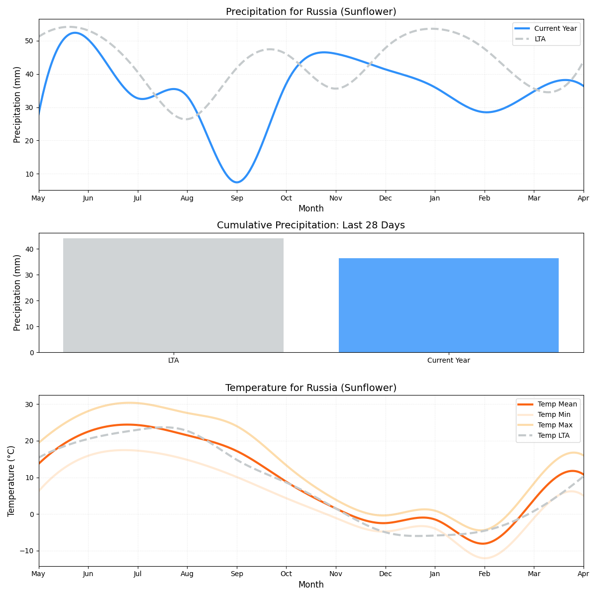 - هطول الأمطار: أعلى بكثير من السنوات السابقة، عند 10.38 ملم مقارنة بمعدل منتظم يبلغ 7.93 ملم. يجب مراقبة الزيادة بنسبة 31٪ في هطول الأمطار للتأثيرات السلبية المحتملة على الحصاد.