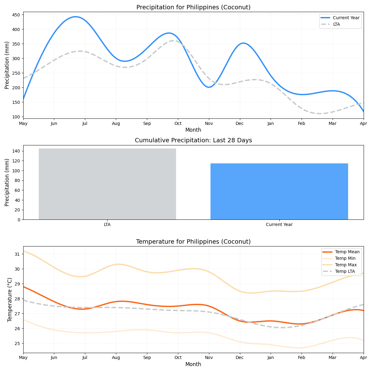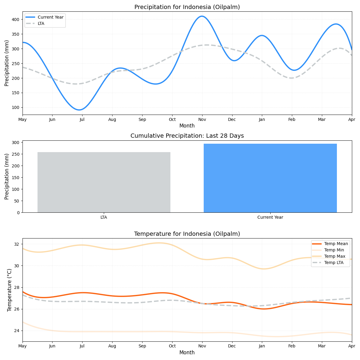 - هطول الأمطار: زاد بنسبة 23٪، حيث بلغ 12.56 ملم مقابل 10.17 ملم قياسي. تزداد المخاوف حيث يمكن أن يؤثر ارتفاع هطول الأمطار على نمو زيوت النخيل.
