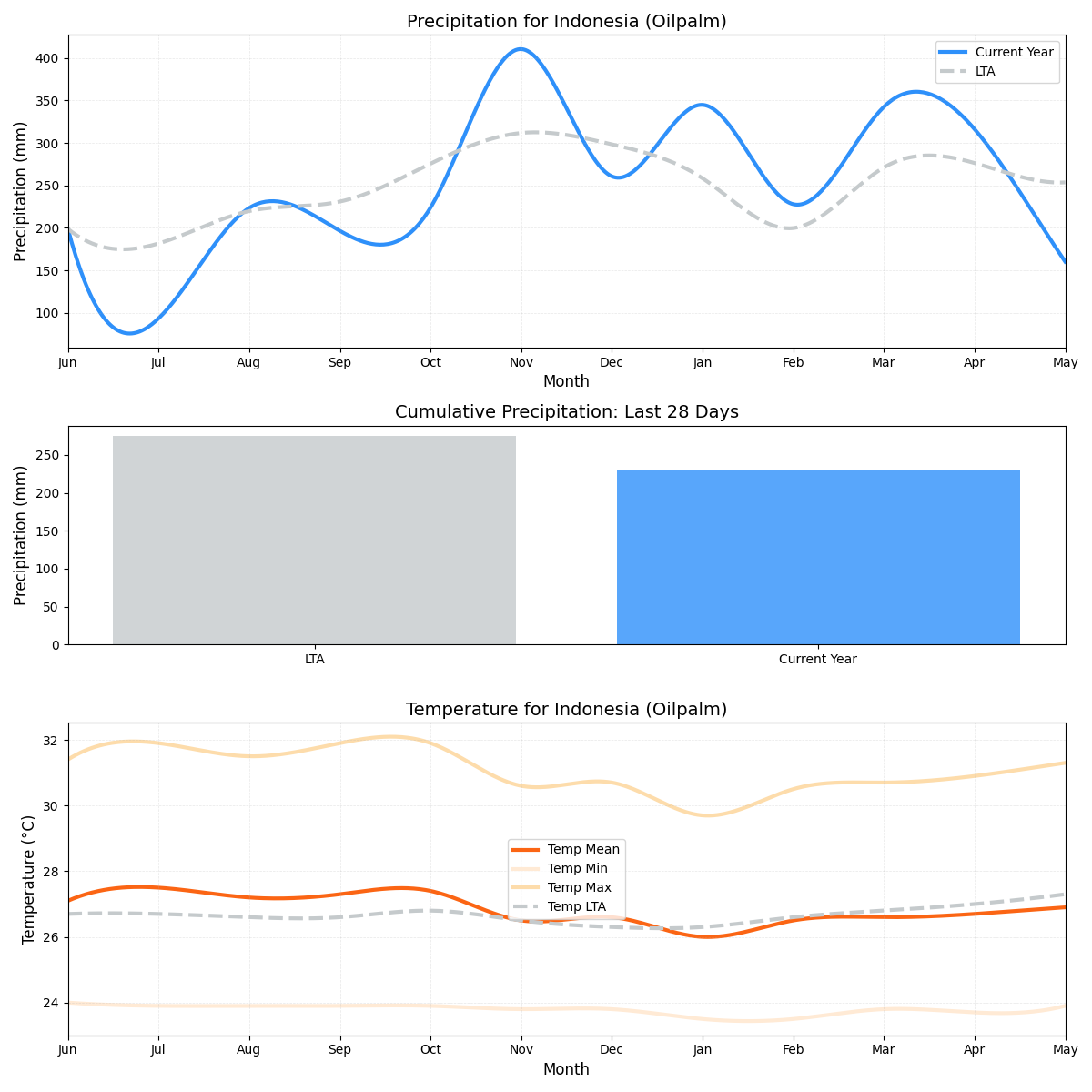 • درجة الحرارة: أقل من المتوسط ​​بشكل معتدل (15.38 درجة مئوية مقابل 17.02 درجة مئوية)، مما يعيق على الأرجح دورة النمو النموذجية.