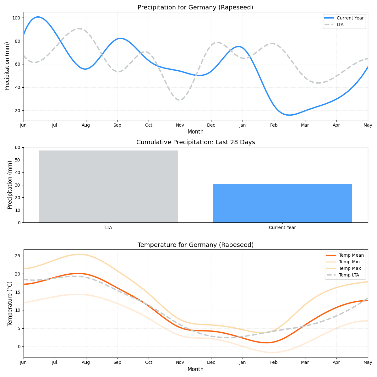 - هطول الأمطار: انخفض بشكل كبير بنسبة 46٪ مقارنة بالمتوسط، فقط 0.46 ملم مقارنة بـ 0.85 ملم المعتادة، مما يخلق حالة جفاف محتملة قد تؤثر على الغلة.