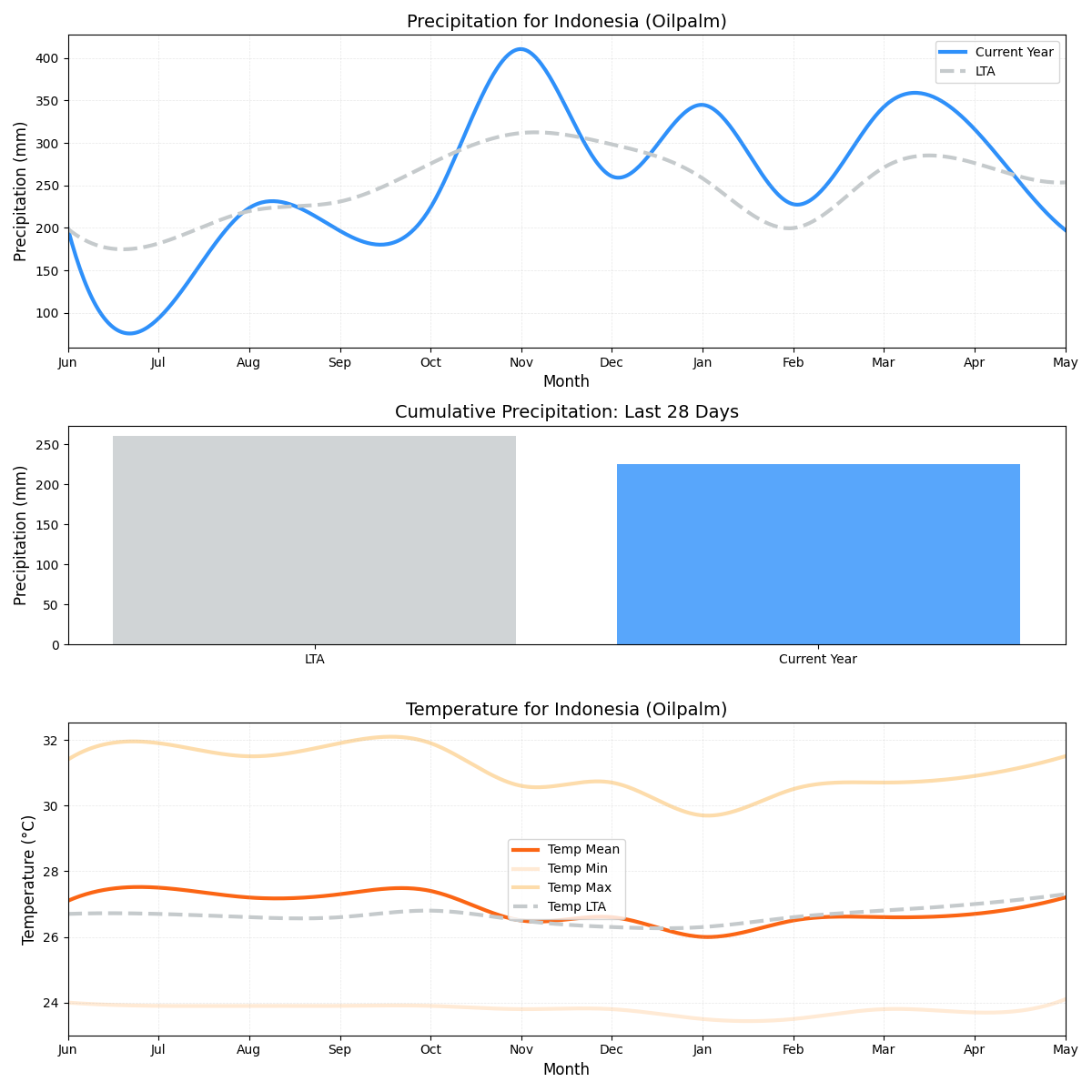 - المخاطر الرئيسية: أعلى خطر، نظرًا لمنطقة زراعة زيت النخيل الشاسعة والانحرافات الجوية الأخيرة – زيادة هطول الأمطار وانخفاض طفيف في درجة الحرارة.