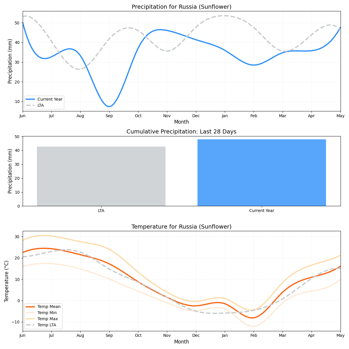 - هطول الأمطار: 50٪ أقل من المتوسط (1.7 ملم مقابل 3.39 ملم)، يشير إلى مشكلة نقص المياه المحتملة التي تؤثر على نمو المحاصيل.
