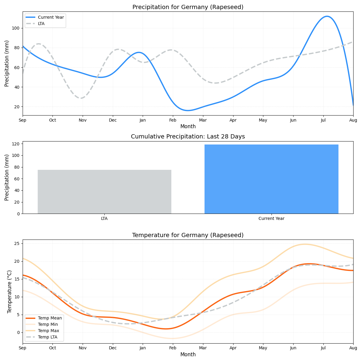 - الخطر الرئيسي: يمثل الحجم الكبير لمنطقة زراعة بذور اللفت خطرًا. يتميز نمط الطقس الحالي بزيادة هطول الأمطار وانخفاض درجات الحرارة.