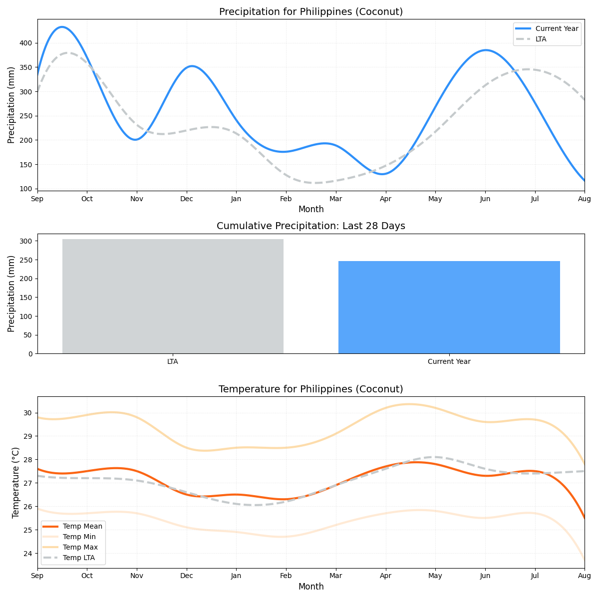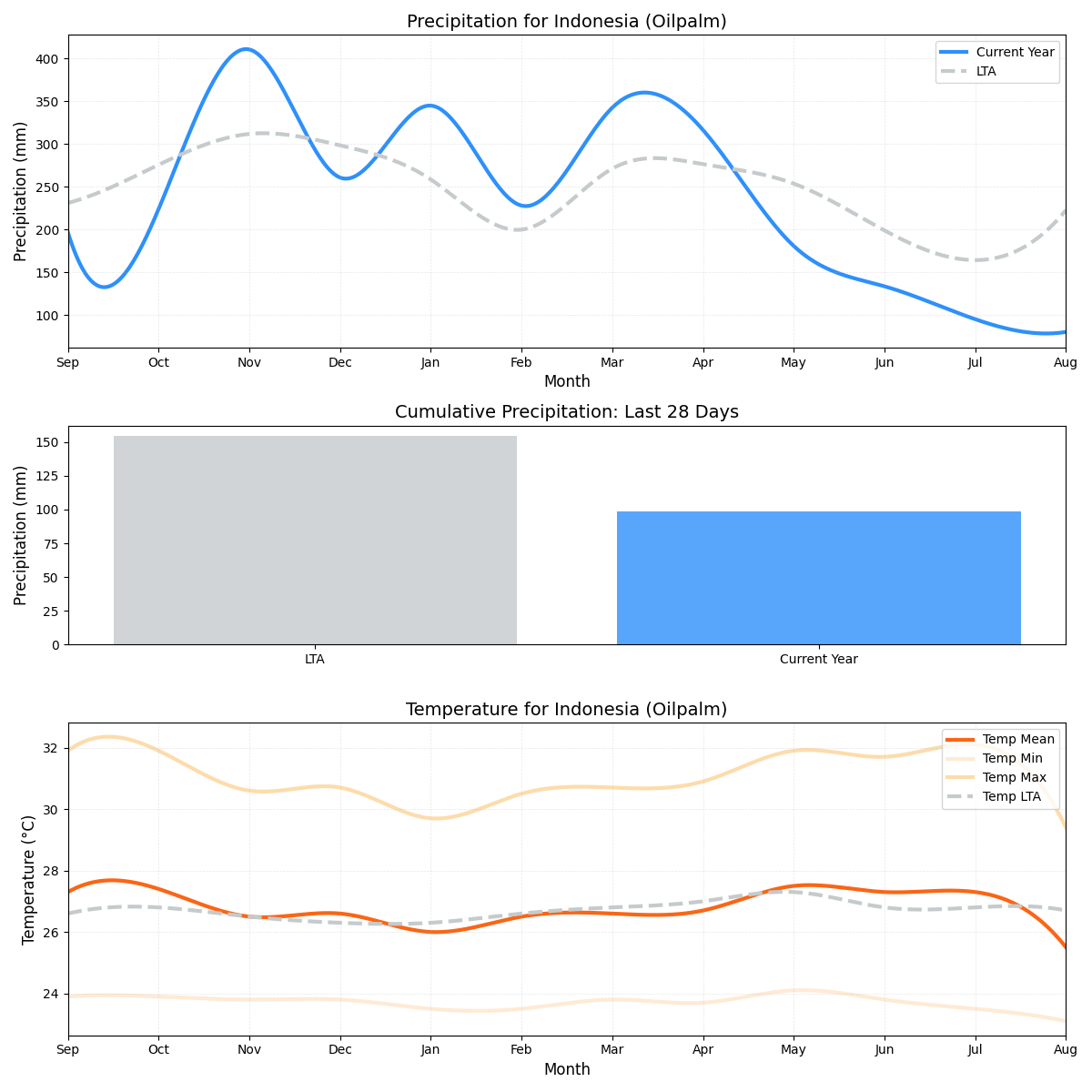 - هطول الأمطار: حوالي 35٪ أقل من المتوسط (80.5 ملم مقابل 123.9 ملم). تزيد فترات الجفاف المؤقتة من المخاطر في هذه المنطقة الرئيسية لزراعة زيت النخيل.