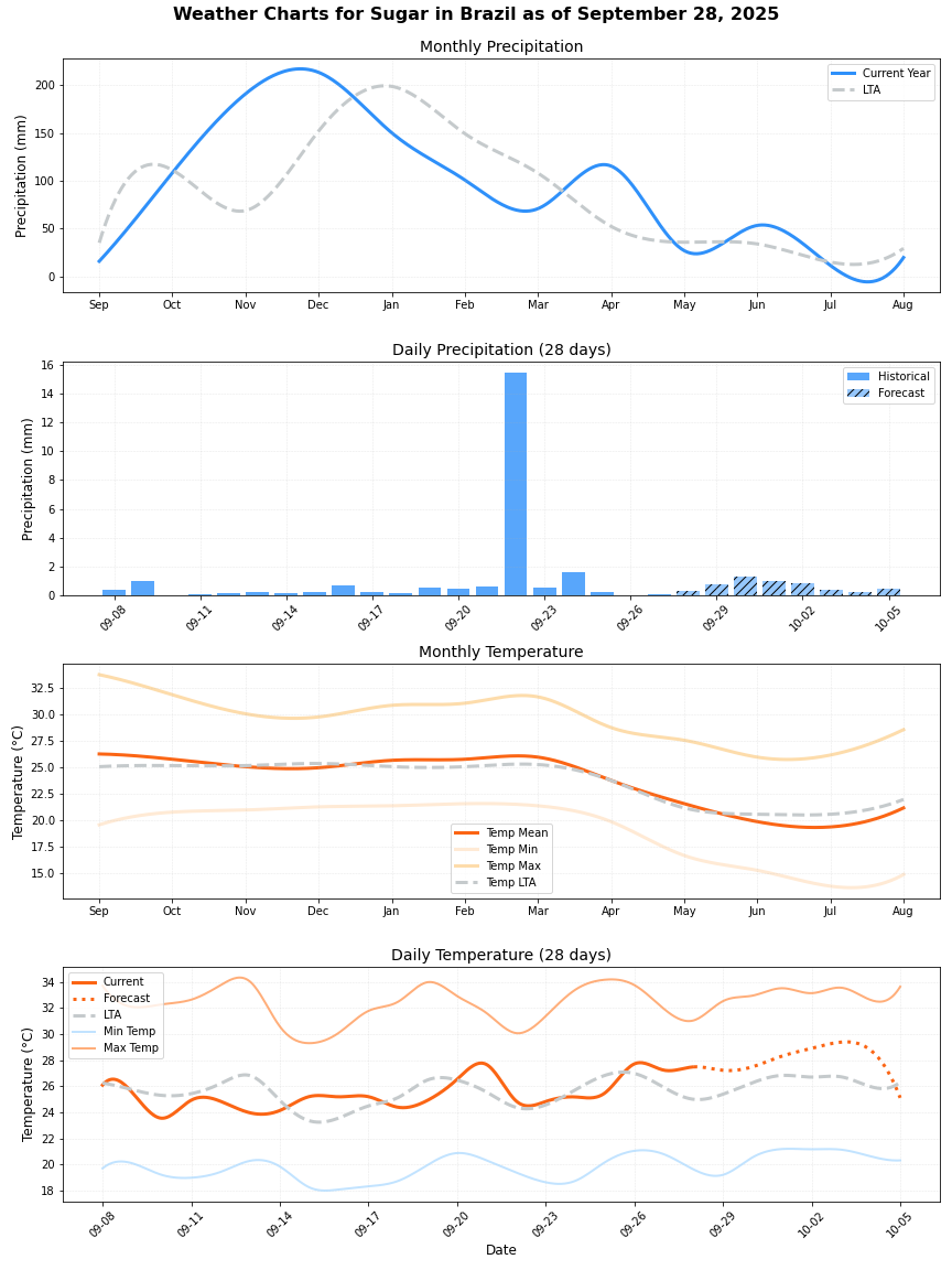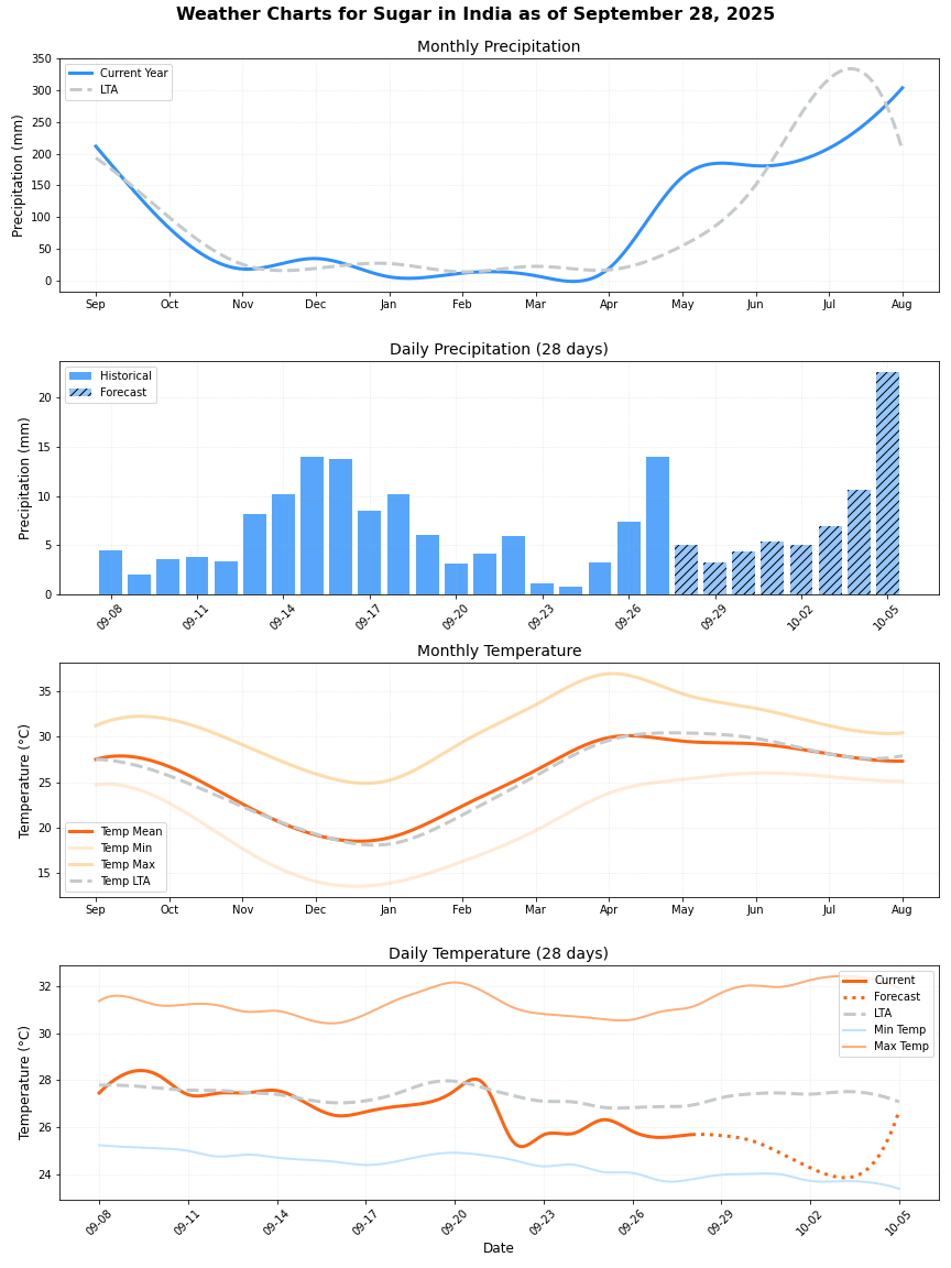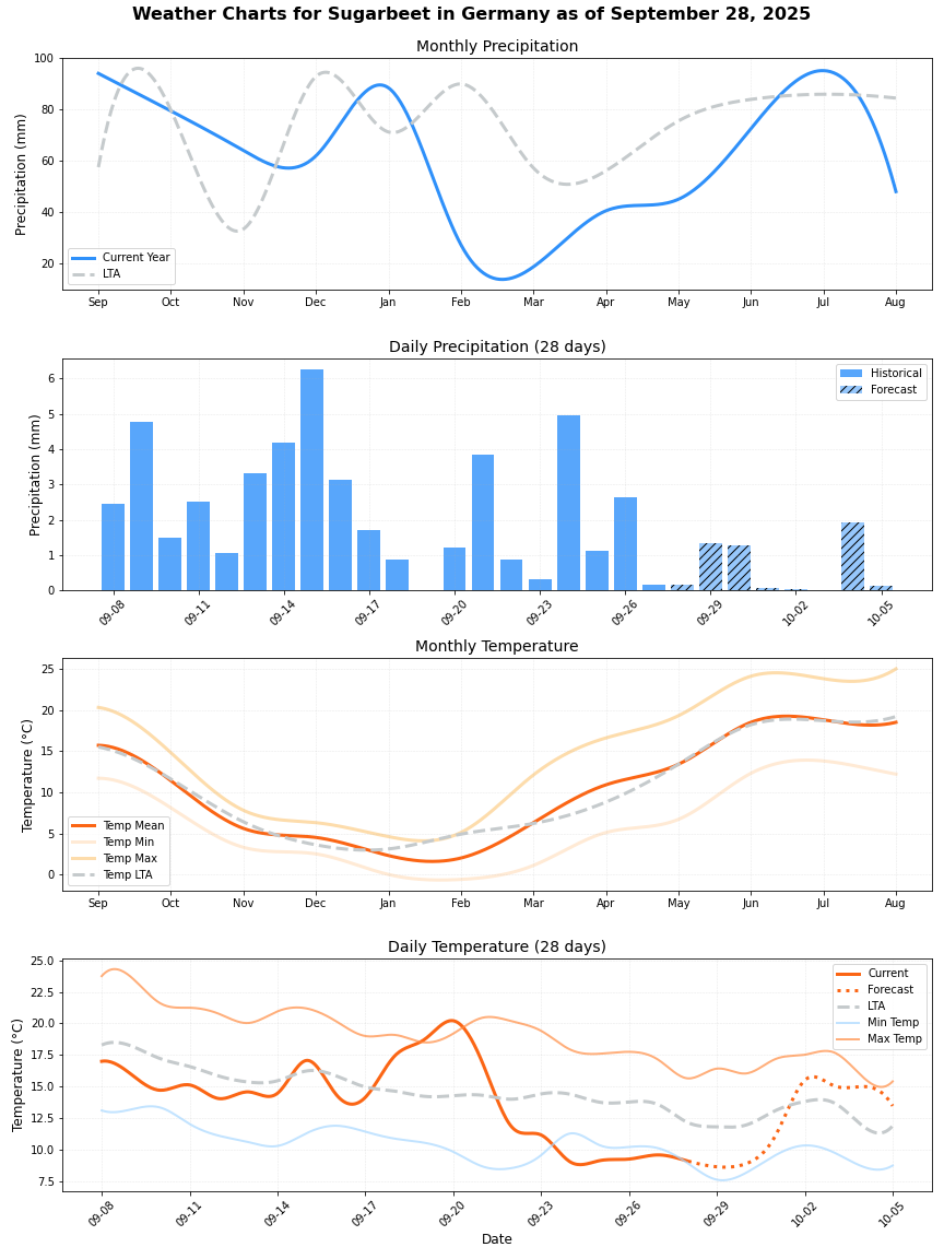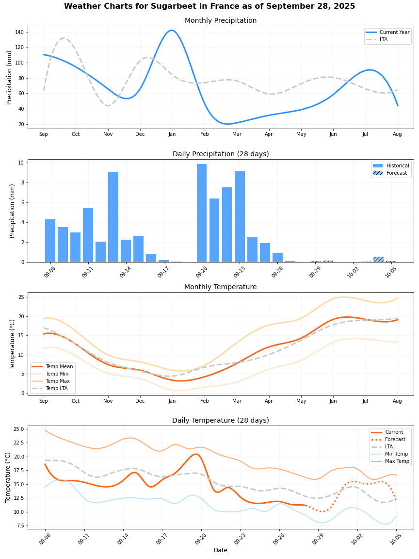 • هطول الأمطار: فرق ضئيل يبلغ حوالي 4% أقل من المتوسط (68.46 ملم مقابل 71.84 ملم). يمكن أن توفر الأمطار المنتظمة ظروفًا مفيدة لنمو بنجر السكر.