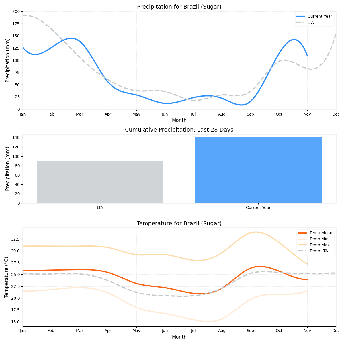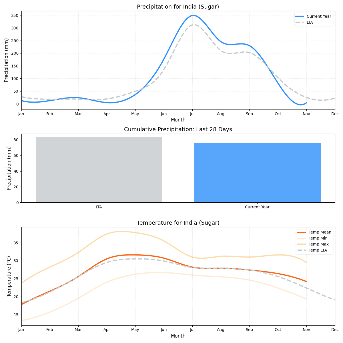 • هطول الأمطار: 36٪ أقل من المتوسط (2.9 ملم مقابل 4.55 ملم). قد يؤثر استمرار هطول الأمطار الأقل من المتوسط سلبًا على حالة قصب السكر.