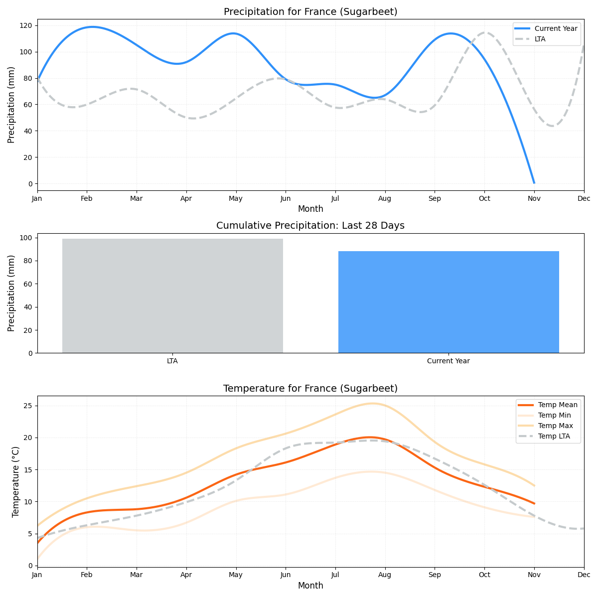 • هطول الأمطار: 27٪ أقل من المتوسط (1.95 ملم مقابل 2.67 ملم). يمثل النقص الكبير في الأمطار خطرًا على محصول بنجر السكر في هذه المنطقة.