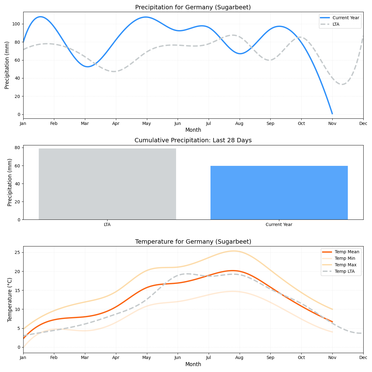 • هطول الأمطار: حوالي 12٪ أقل من المتوسط (2.01 ملم مقابل 2.28 ملم). أدى النقص النسبي في هطول الأمطار في هذه الفترة إلى زيادة المخاطر على زراعة بنجر السكر في المنطقة.