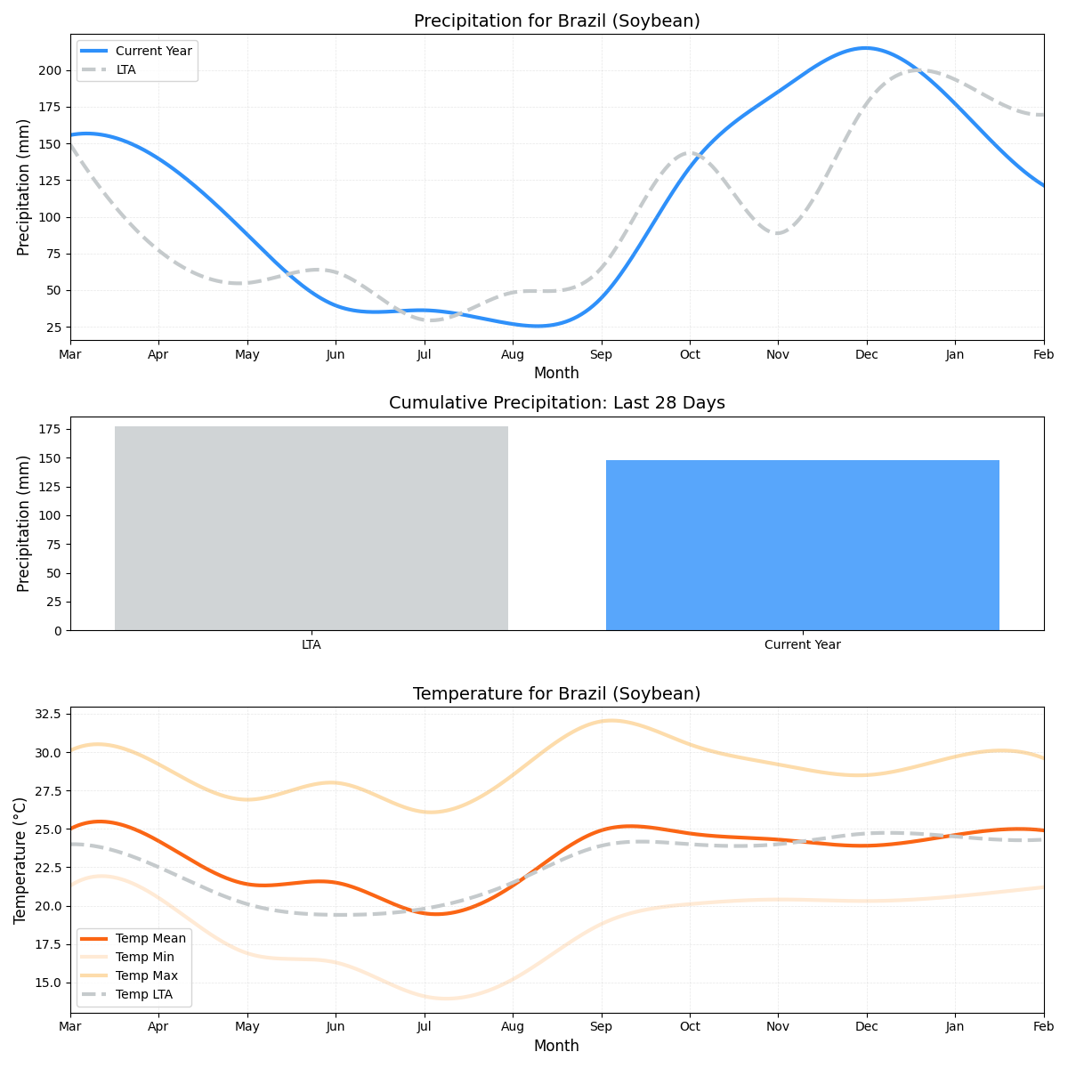• هطول الأمطار: أقل من المتوسط ​​بنسبة 39٪ (2.6 ملم مقابل 4.26 ملم). تشكل الظروف الأكثر جفافاً خطرًا كبيرًا على هذه المنطقة الرئيسية المنتجة لفول الصويا.