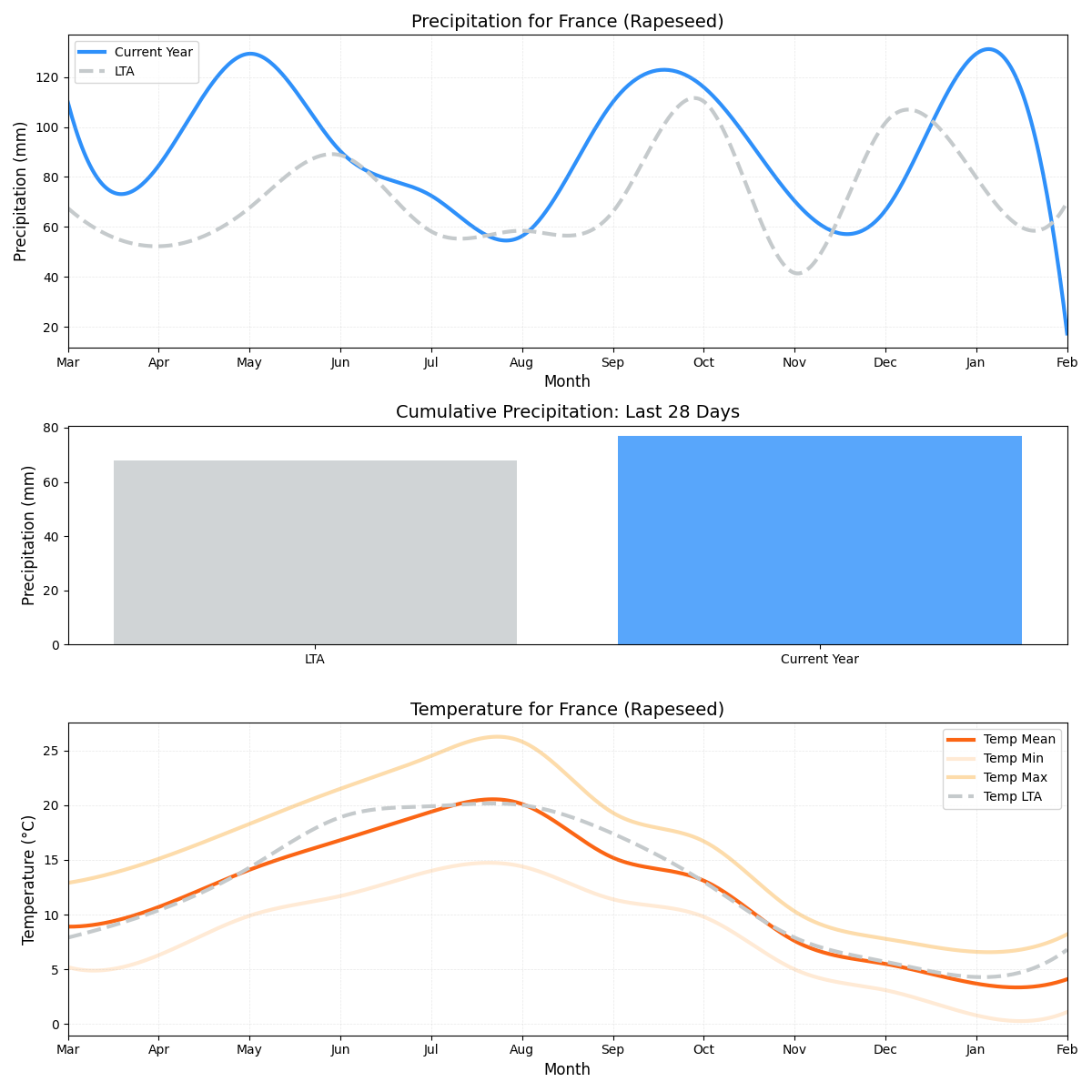 • هطول الأمطار: أقل بحوالي 10٪ من هطول الأمطار القياسي (3.71 ملم مقابل 4.14 ملم). يوفر هذا الانخفاض الكبير قلقًا كبيرًا ويشكل خطرًا أكبر على إنتاج المحاصيل المتوقعة.