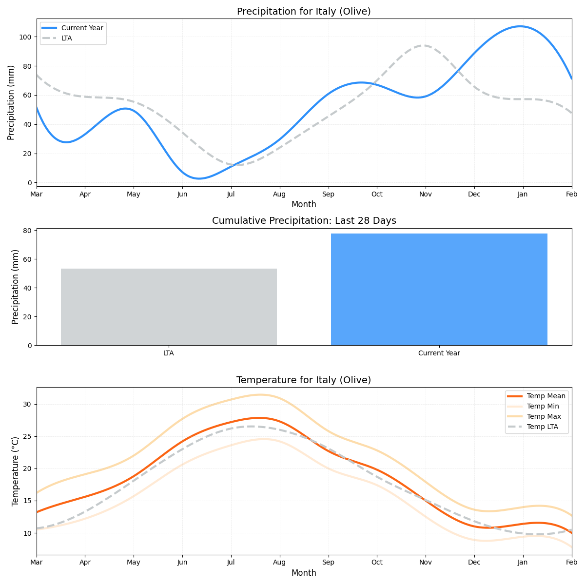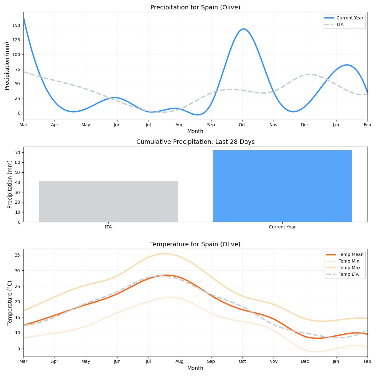 • هطول الأمطار: أقل من المتوسط ​​بنسبة 14٪ (7.87 ملم مقابل 9.19 ملم). يمكن أن يؤدي نقص الأمطار إلى إعاقة نمو المحاصيل، مما قد يؤثر على الإنتاج الإجمالي.