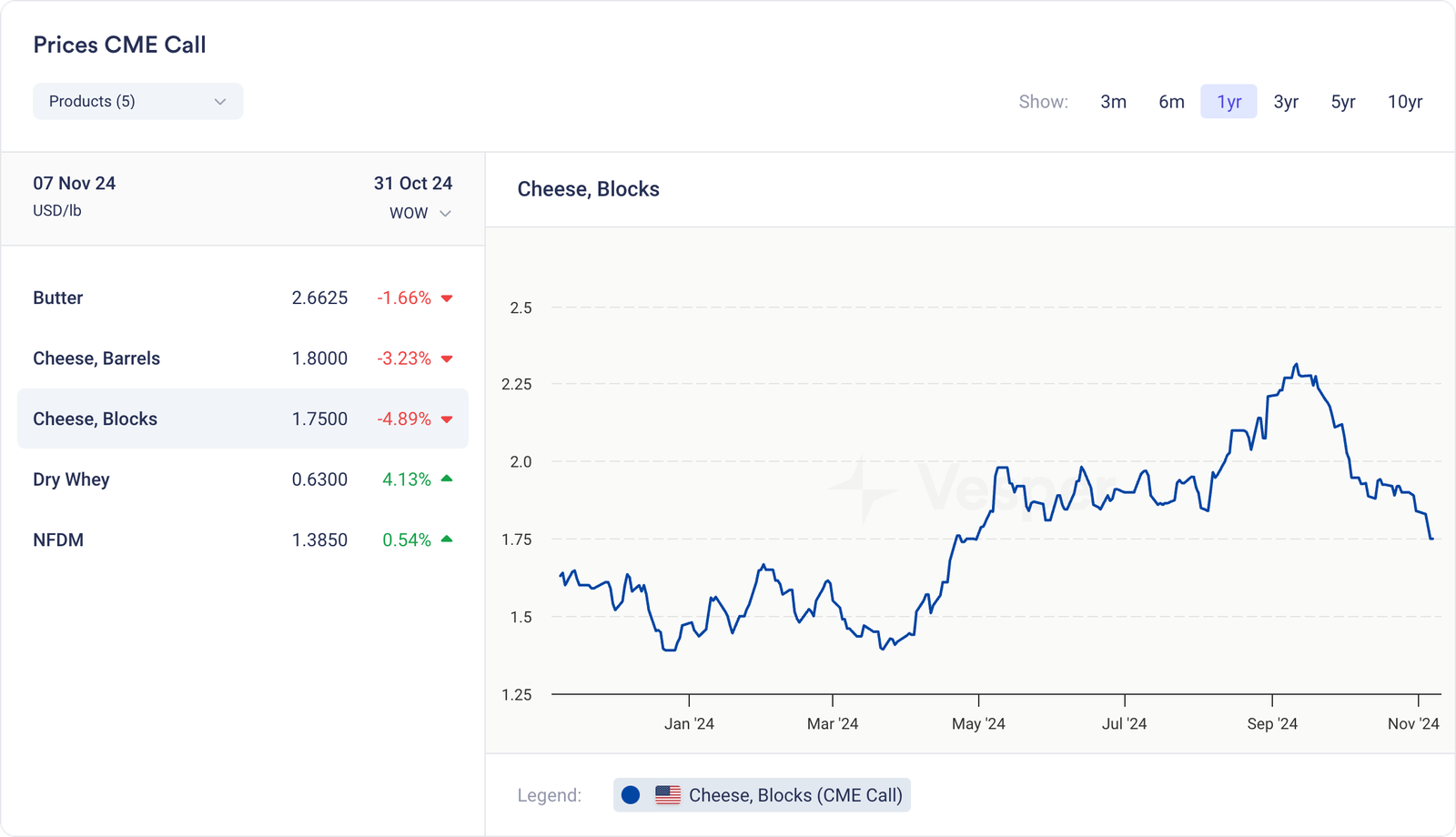 فقدت أسعار الزبدة بضعة سنتات فقط، في حين أن أسعار قوالب الجبن لم تتمكن من التمسك بـ “80 سنت” وانخفضت إلى 1.75 دولار للرطل في نهاية يوم الخميس. أشارت أرقام التخزين البارد للأسبوع الماضي لشهر سبتمبر إلى مستويات مخزون منخفضة نسبيًا للجبن، وكانت أحجام الإنتاج لهذا الأسبوع لشهر سبتمبر أعلى بنسبة +0.88٪ فقط على أساس سنوي بعد شهرين من النمو بنسبة > +3٪. دفعت مجموعة العوامل الأسعار إلى الانخفاض الطفيف.
