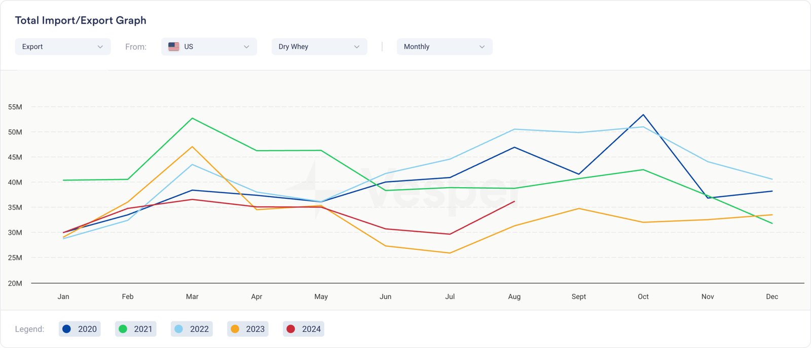 عندما يتعلق الأمر بفهم التدفقات التجارية، فإن السياق هو كل شيء. بالتأكيد، غالبًا ما يسرق النمو على أساس سنوي (YoY) الأضواء، لكن النظرة الأوسع تساعدنا على فهم المزيد حول إلى أين تتجه الاتجاهات حقًا. خذ صادرات مصل اللبن الجاف الأمريكية: إذا قارنا فقط بين عامي 2023 و 2024، يبدو الأمر وكأنه قصة عودة قوية. بدأنا العام ببطء، لكن كل شهر أظهر تحسنًا، حيث دفع شهر سبتمبر النمو منذ بداية العام حتى تاريخه (YTD) إلى المنطقة الإيجابية (+0.52٪) بعد التأخر عن عام 2023. ولكن إذا قمنا بتكبير الصورة إلى منظور خمس سنوات، فإن الصورة تتغير بشكل كبير. يقل كل من عامي 2023 و 2024 بحوالي 50 مليون رطل عن أرقام عام 2022، وينخفض بمقدار 80 مليون رطل عن عام 2021. هذا انخفاض حاد، مدفوع إلى حد كبير ببرودة الطلب من الصين، التي لا تزال تؤثر على ديناميكيات مصل اللبن الجاف.