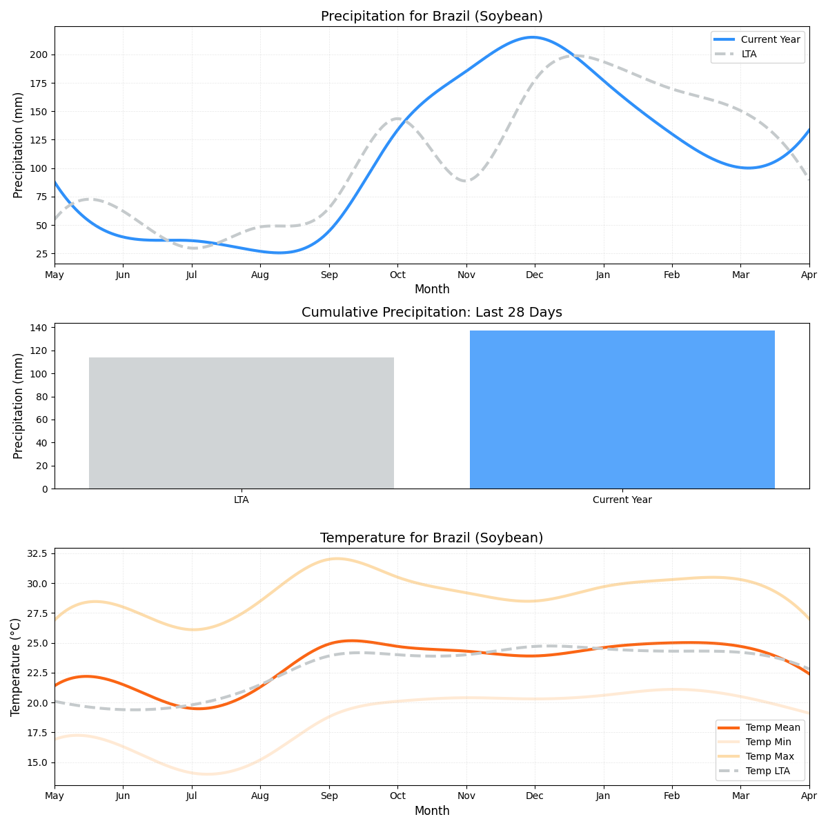 - الخطر الرئيسي: تشهد أعلى مستوى من الخطر بسبب انخفاض كبير في هطول الأمطار إلى جانب انخفاض في متوسط درجة الحرارة. يشكل هذا المزيج خطرًا كبيرًا على مناطق إنتاج فول الصويا الشاسعة.