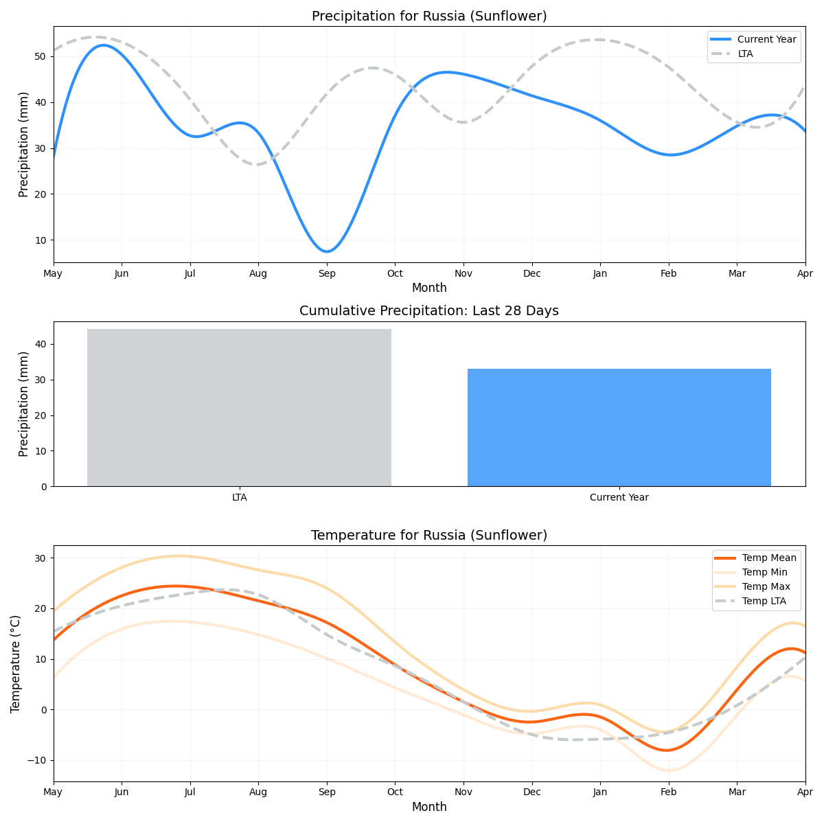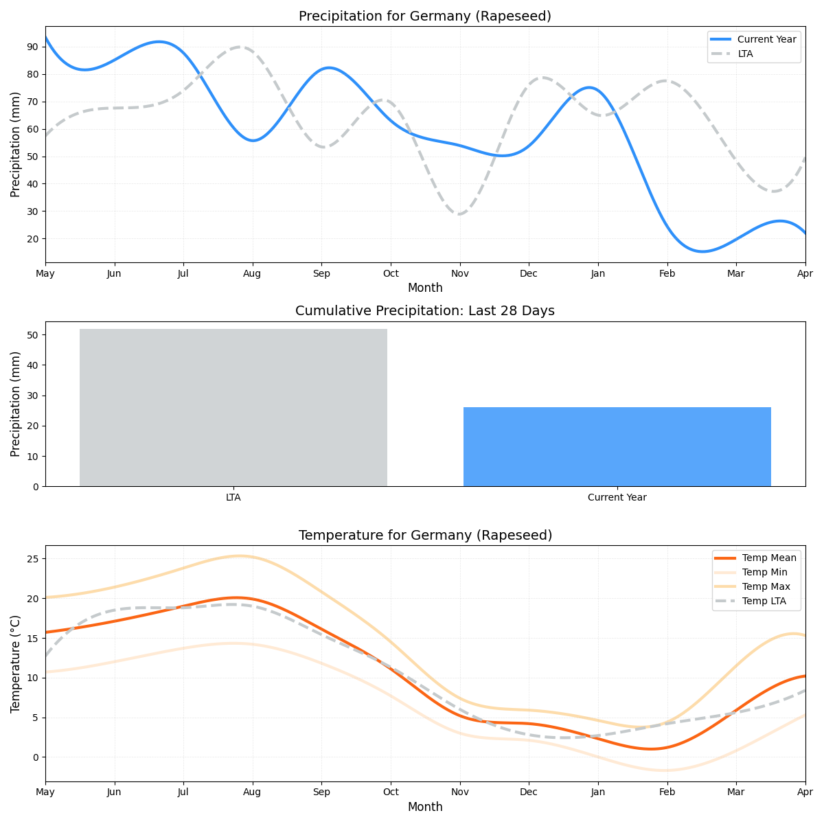 - هطول الأمطار: أقل بنسبة 71٪ من المتوسط (0.46 ملم مقابل 1.61 ملم). قد يؤثر مستوى هطول الأمطار المنخفض هذا على غلة بذور اللفت المستقبلية.