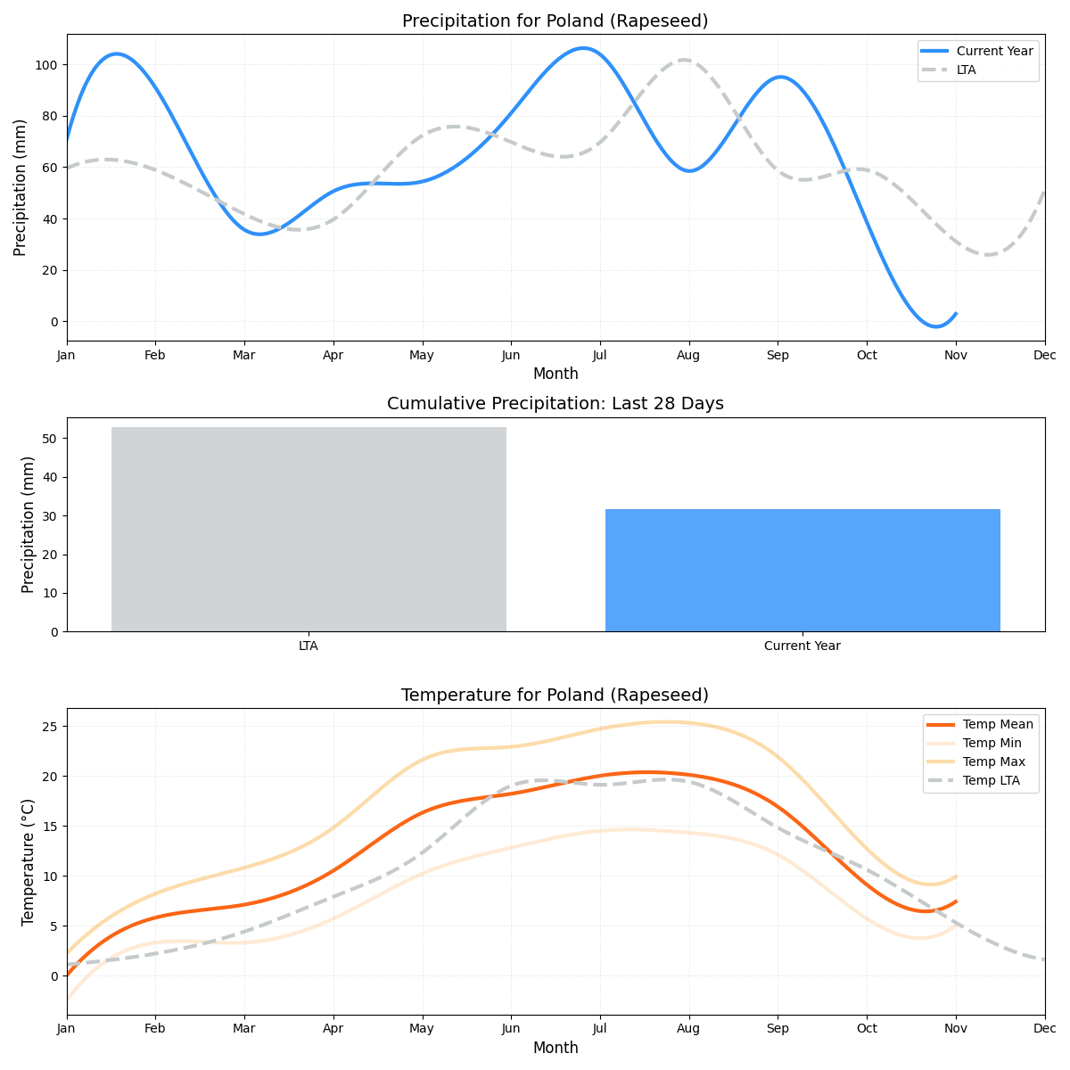 - هطول الأمطار: أقل من المتوسط بنسبة 4٪ ولكنه قريب من المعدل الطبيعي (3.29 ملم مقابل 3.46 ملم).