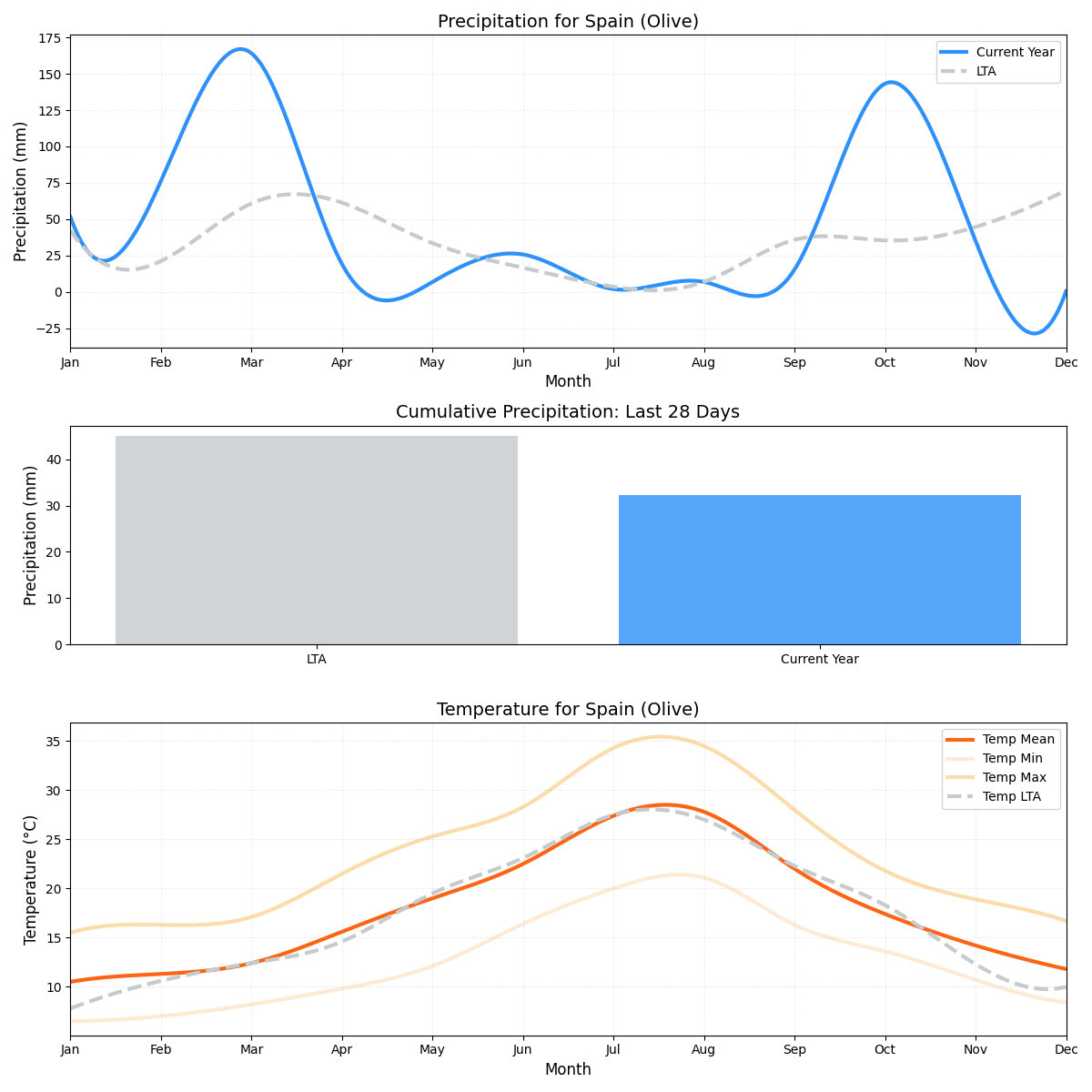 - الخطر الرئيسي: إنتاج الزيتون المعتدل معرض لخطر انخفاض هطول الأمطار عن المتوسط، على الرغم من أن درجات الحرارة المرتفعة قليلاً قد تعوض الخطر.