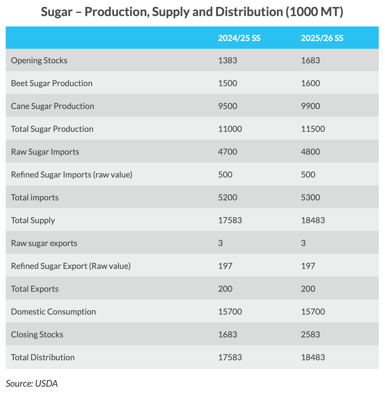 مع توقع الإنتاج المحلي عند 11.5 مليون طن، ستكون هناك فجوة في العرض تبلغ حوالي 4.2 مليون طن لتلبية الاستهلاك المحلي الذي من المتوقع أن يظل دون تغيير عند 15.7 مليون طن في 2025/26SS. من المتوقع أن تبلغ الواردات 5.3 مليون طن، بزيادة 100000 طن عن الموسم السابق، لسد هذه الفجوة وربما إعادة بناء المخزونات. ومع ذلك، فإن هذه الزيادة في واردات الصين من السكر الخام هي في المقام الأول نتيجة للحظر المستمر على شراب السكر التايلاندي والمسحوق المخلوط مسبقًا والذي كان يحل سابقًا محل جزء من واردات الصين من السكر الخام.