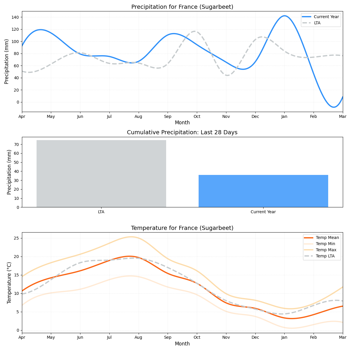 - هطول الأمطار:أقل بنسبة 15٪ من المتوسط (1.34 ملم مقابل 1.58 ملم)، وهي مشكلة محتملة أخرى لمزارعي بنجر السكر.