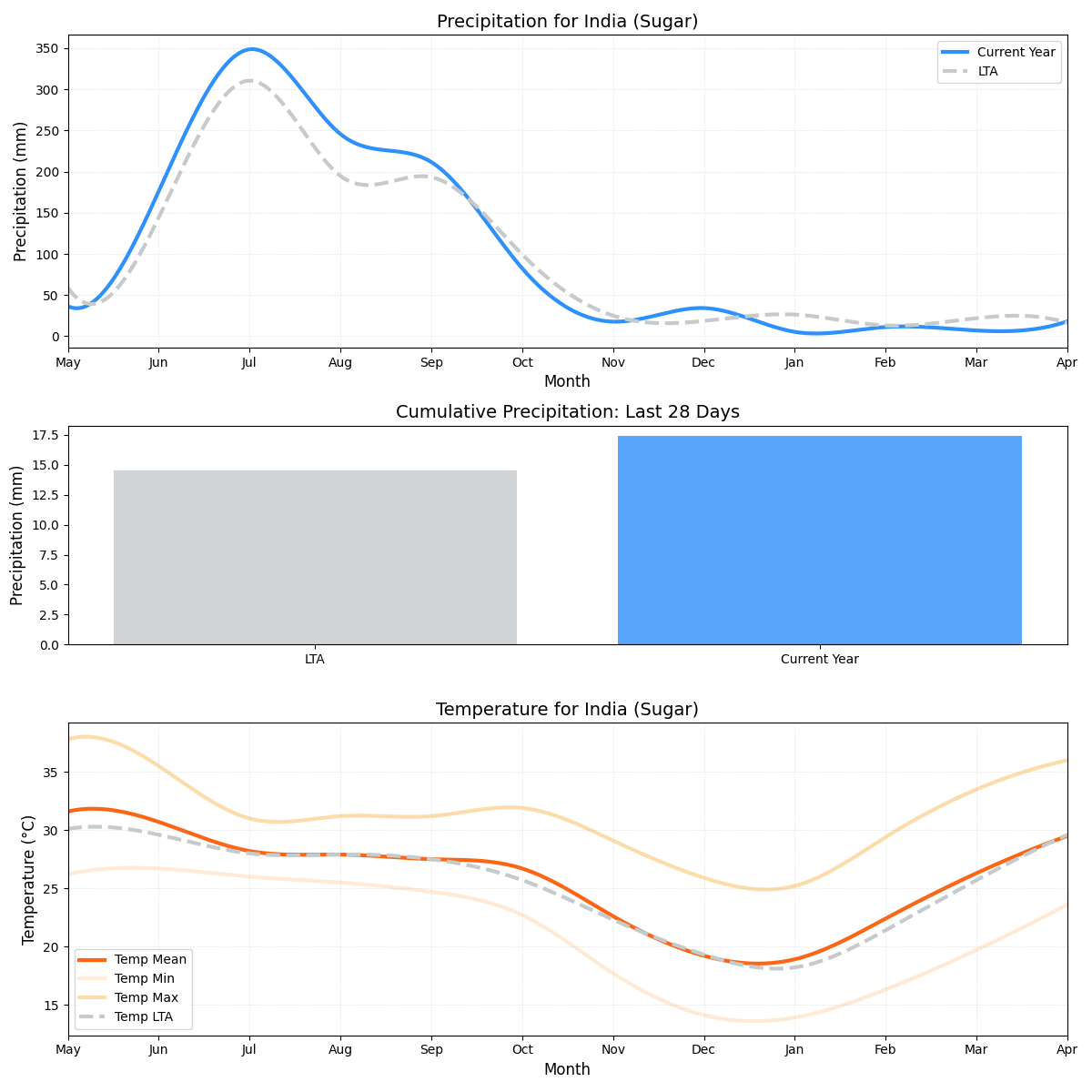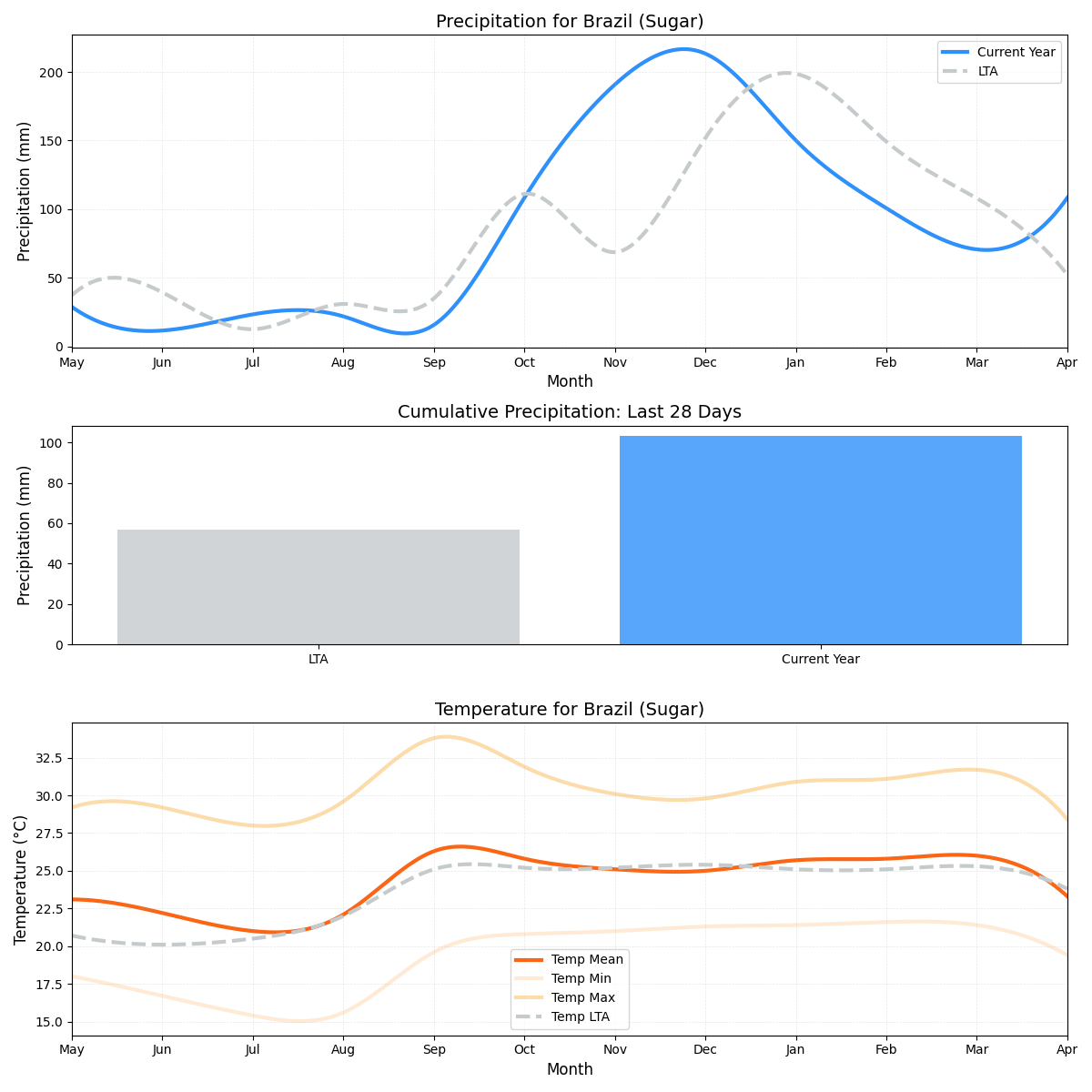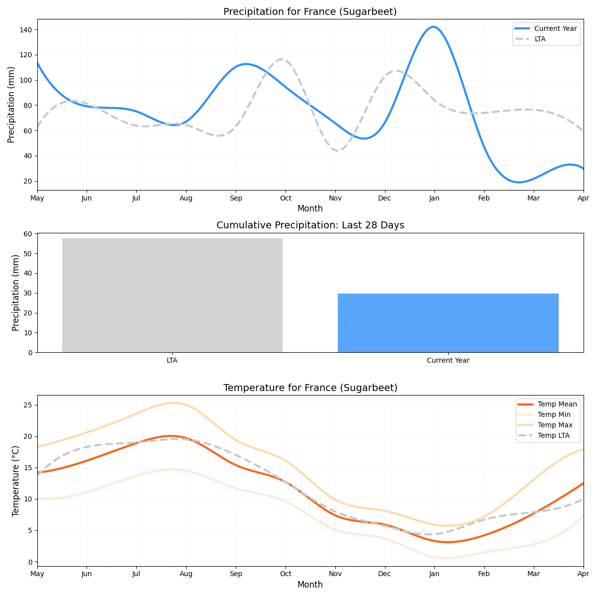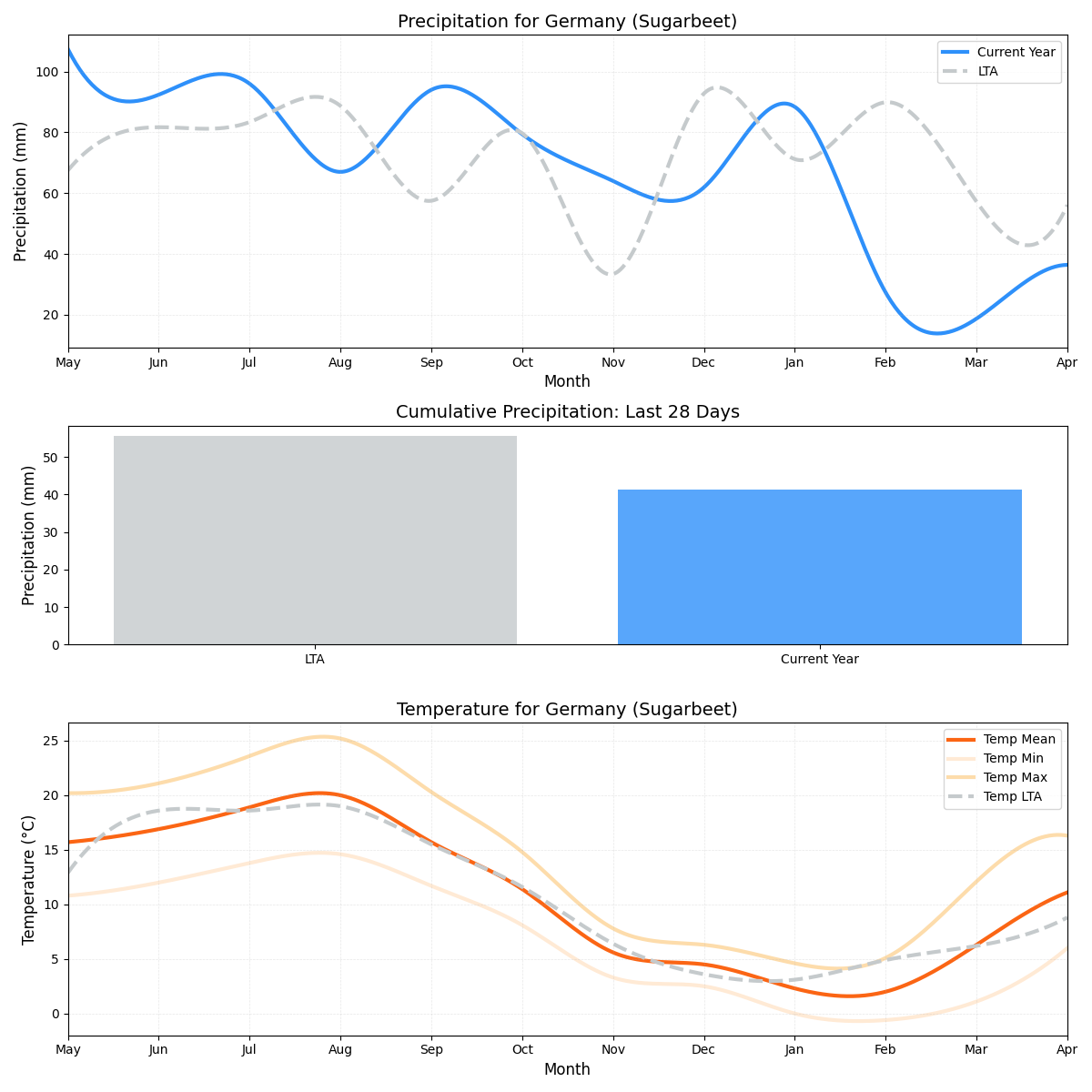 - هطول الأمطار:تعرض المنطقة جفافًا مقلقًا بمعدل هطول أمطار أقل بنسبة 49٪ من المتوسط (0.73 ملم مقابل 1.44 ملم). قد يؤثر هذا الانخفاض في كمية الأمطار سلبًا على ترطيب بنجر السكر، مما يؤثر على نموه وجودته.