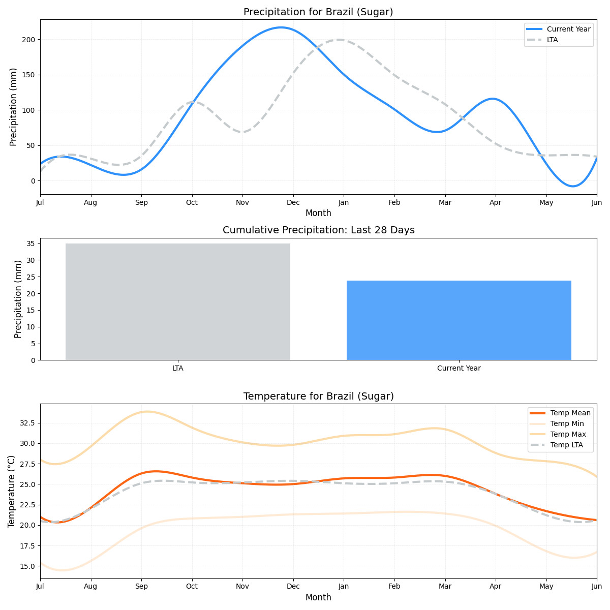 • المخاطر الرئيسية: زيادة المخاطر بسبب أنماط الطقس غير المنتظمة في هذه المنطقة المنتجة للغاية لقصب السكر. يضاف إلى ذلك هطول الأمطار الأعلى من المعتاد ودرجات الحرارة الأكثر برودة قليلاً.