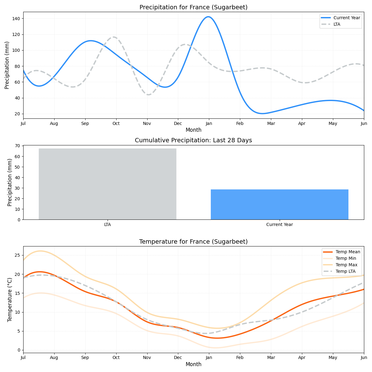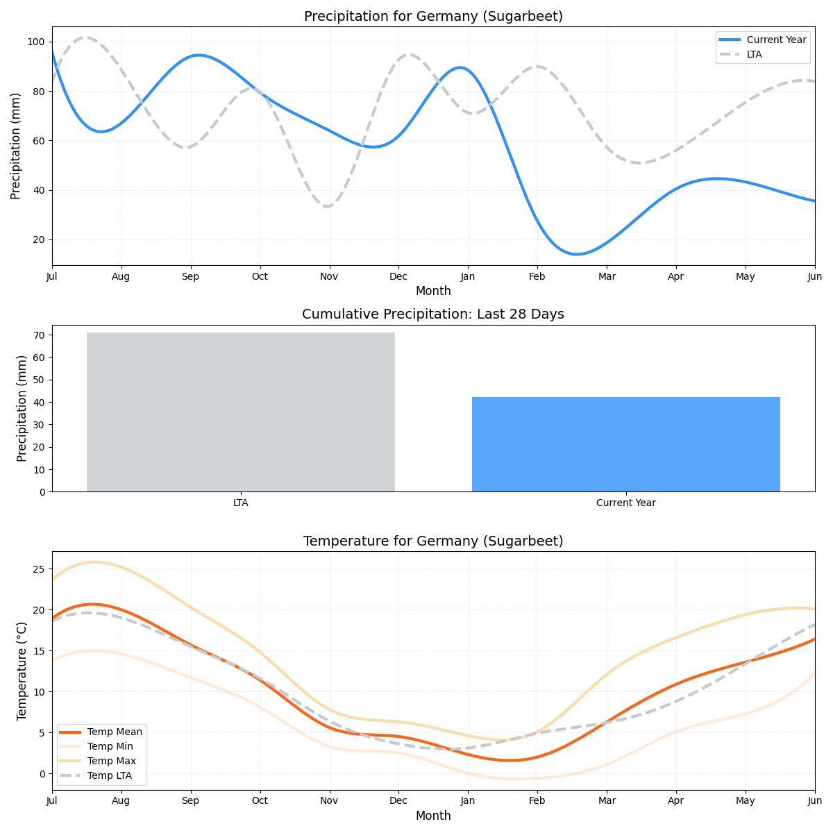 • هطول الأمطار: على غرار الشرقية، هناك انخفاض بنسبة 60٪ في هطول الأمطار، مسجلاً 0.86 ملم مقابل متوسط ​​2.16 ملم. يشكل الانخفاض الشديد في مستويات هطول الأمطار تحديًا محتملاً لزراعة بنجر السكر.