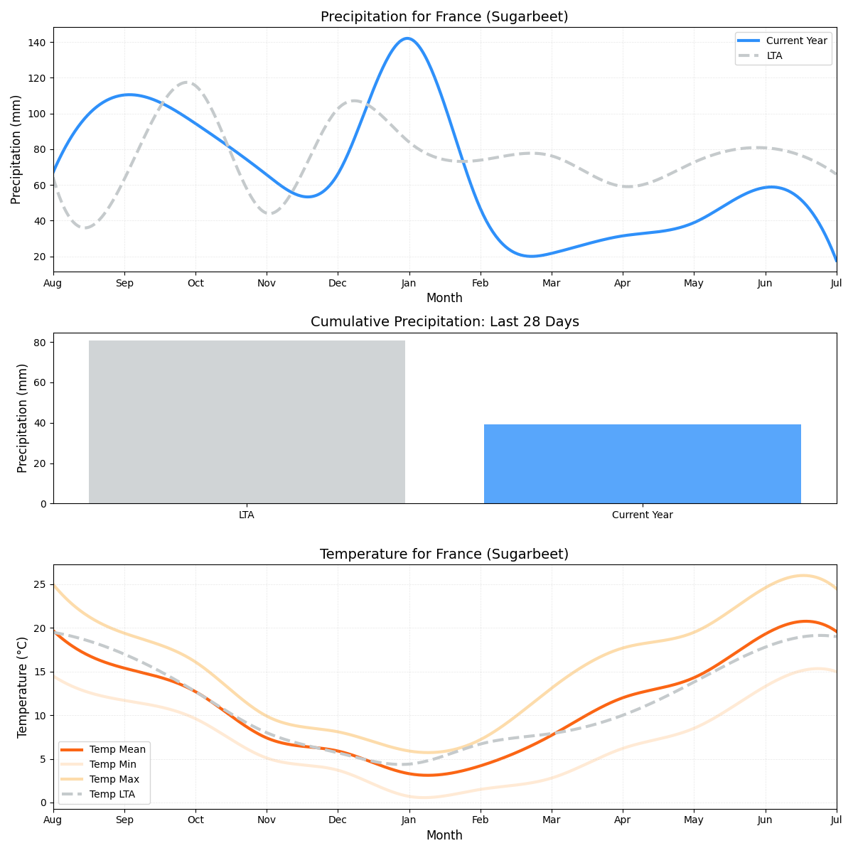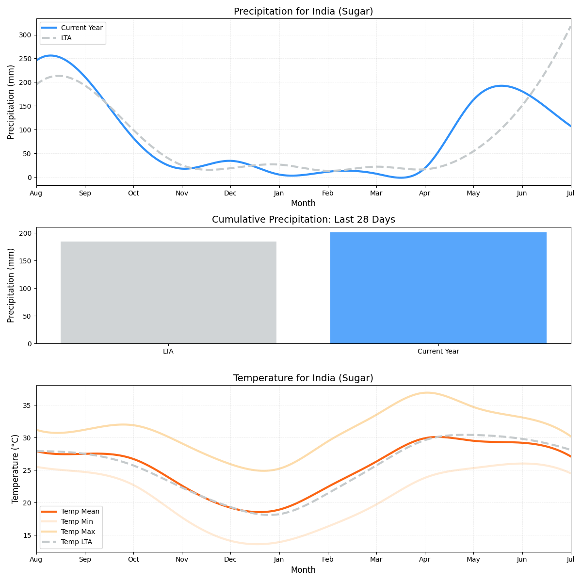 - درجة الحرارة: بالقرب من المتوسط، ولكن أي تقلبات يمكن أن تؤثر على المحاصيل (28.44 درجة مئوية مقابل 28.38 درجة مئوية).