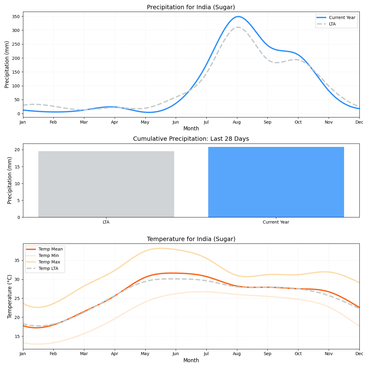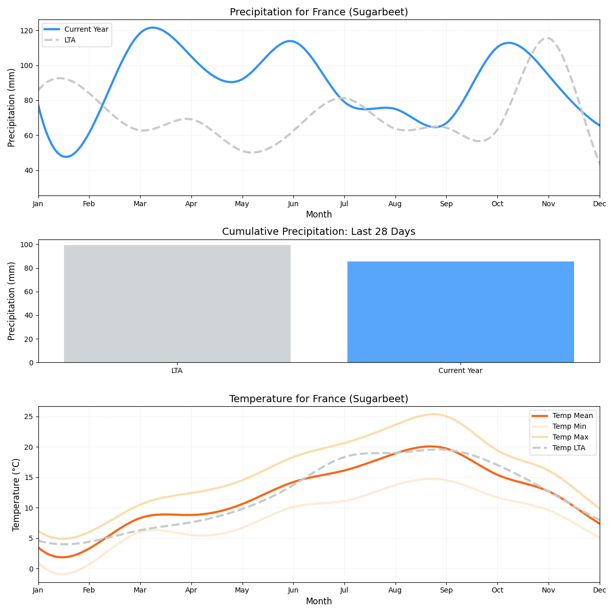 • هطول الأمطار: أعلى بنسبة 136% من المتوسط (5.67 ملم مقابل 2.4 ملم). هذه الزيادة الشديدة ربما رفعت تأثير المخاطر على إنتاج بنجر السكر في المنطقة بشكل كبير.