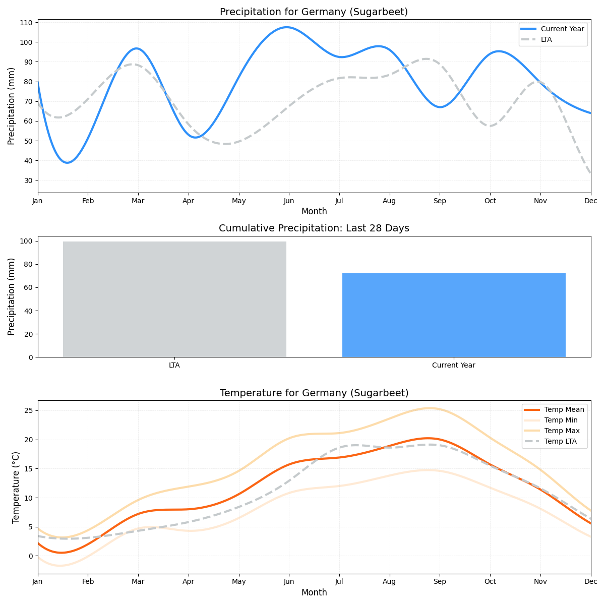 • المخاطر الرئيسية: خطر حرج على بنجر السكر بسبب هطول الأمطار الأعلى بكثير من المتوسط ودرجات الحرارة المنخفضة. تشكل هذه الظروف الجوية المتطرفة تهديدًا كبيرًا لإنتاج بنجر السكر الرائد في المنطقة.