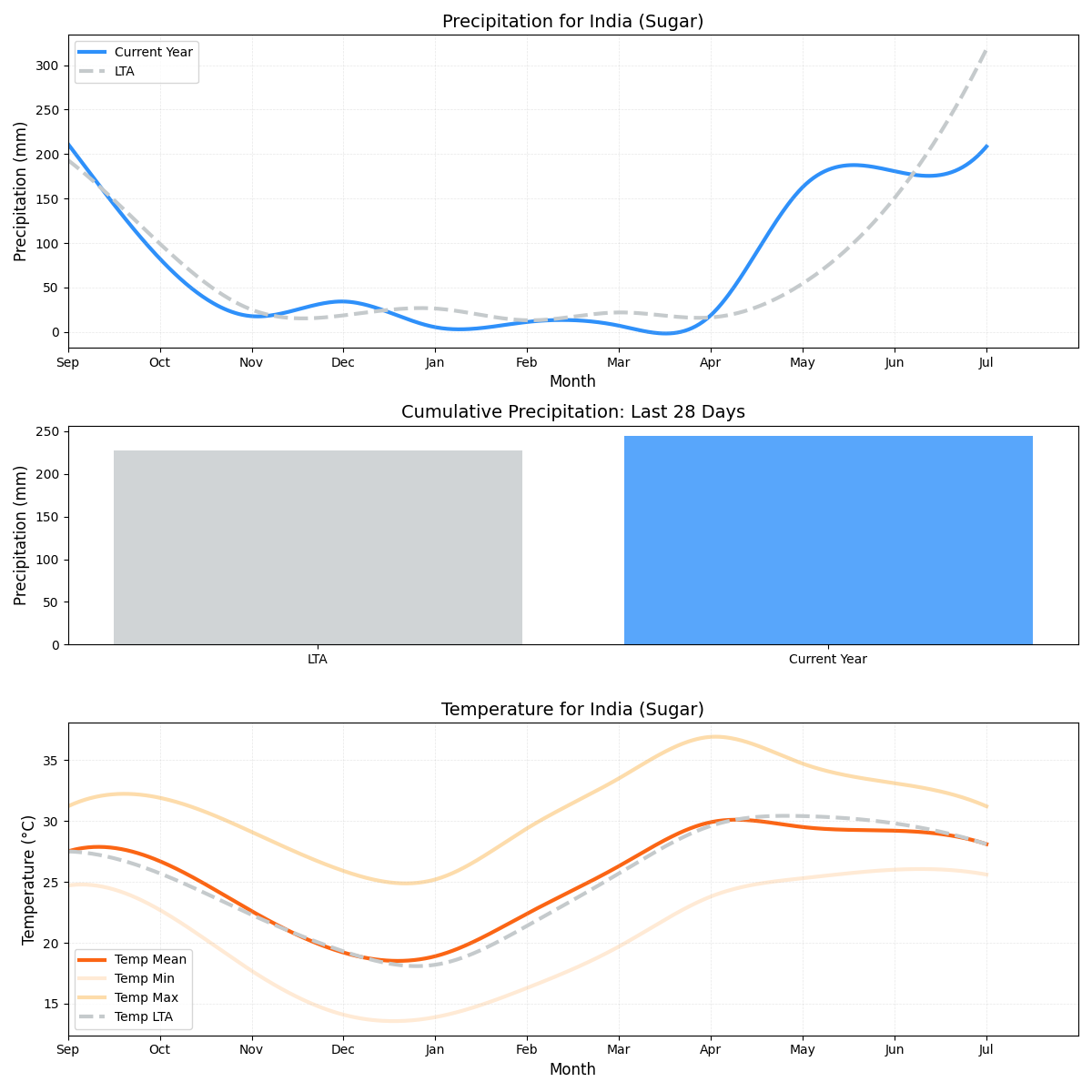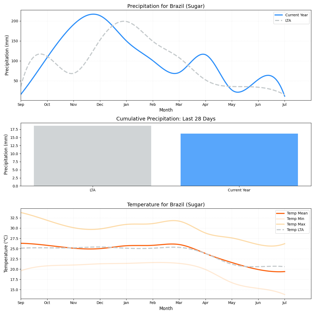 - هطول الأمطار: 17٪ أقل من المتوسط (24.62 ملم مقابل 29.69 ملم)، مما يعني فترة أكثر جفافًا لقصب السكر. بالنظر إلى مستويات هطول الأمطار المتوقعة، فقد يؤثر ذلك على الغلة.